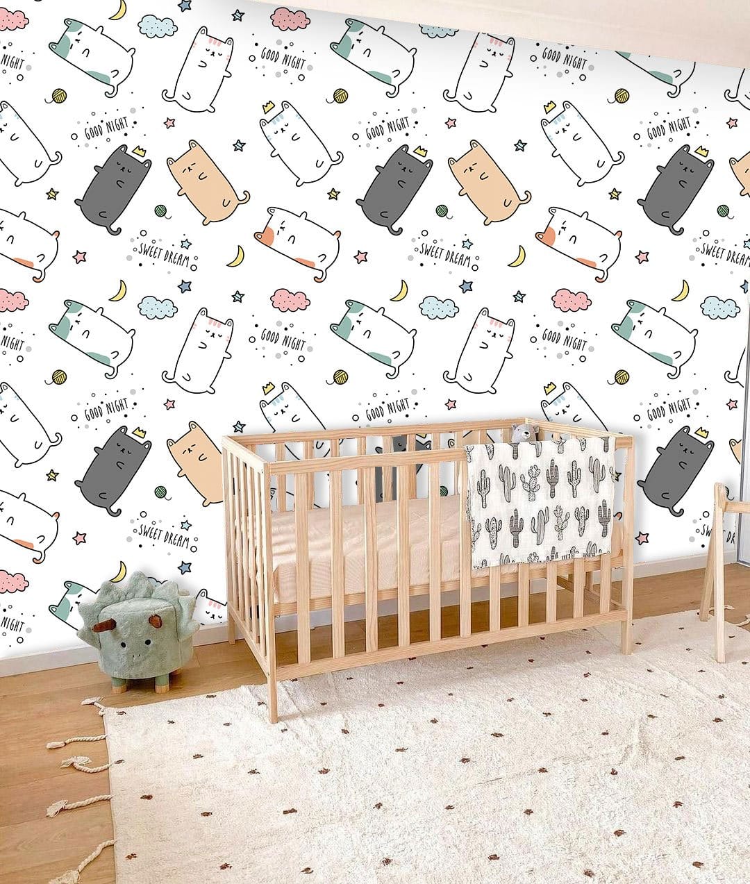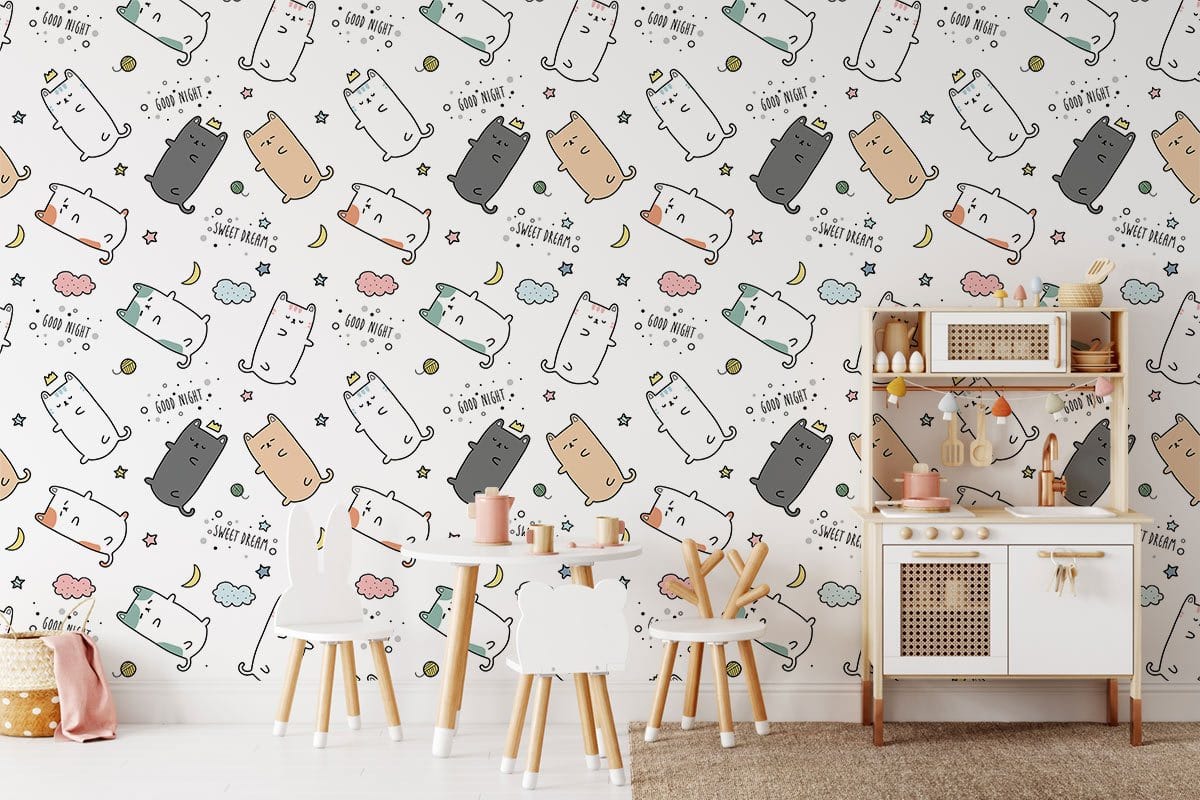 The Good Night Wallpaper Mural features a charming array of illustrated sleeping cats nestled amongst whimsical stars and crescent moons, all against a calming white backdrop. Its playful design and subtle humour lend a delightful touch to any room, creating an inviting and relaxed atmosphere. Perfect for those seeking a balance of playfulness and elegance, this mural provides a delightful twist for any interior space.