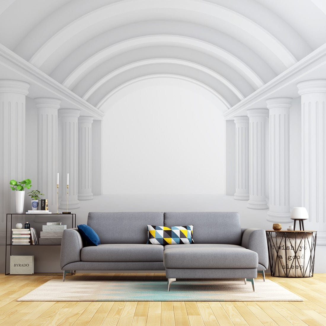The Grand Archway Columns Mural Wallpaper embodies elegance with its classic design, featuring grandiose archways and pristine columns that evoke a sense of architectural brilliance. This design invites a spacious and airy feel, perfectly capturing light and shadow to create depth and sophistication. Its refined aesthetic effortlessly complements both traditional and contemporary interior settings.