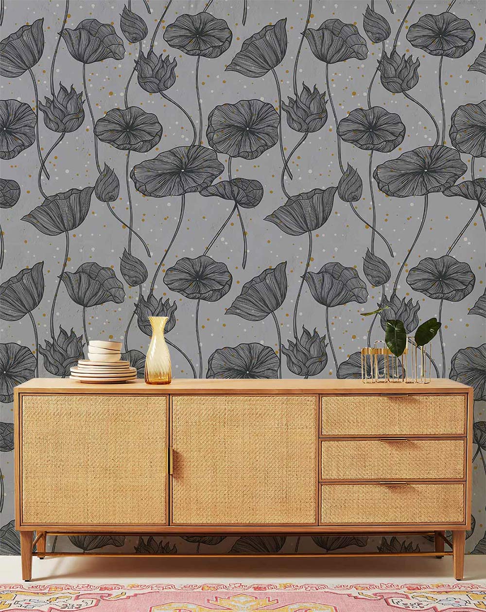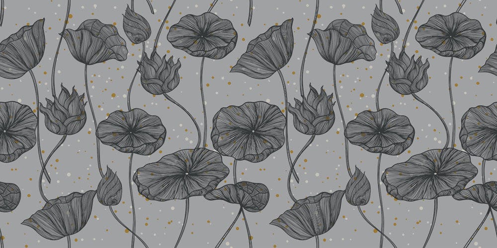 Immerse your space in serene sophistication with the Gray Lotus Wallpaper Mural. Featuring delicate lotus motifs in elegant charcoal lines against a muted grey backdrop, dotted subtly with gold speckles, this mural exudes a tranquil yet luxurious ambience. Perfect for a feature wall in any setting, it effortlessly complements both classic and contemporary décors, melding rich artistry with refined elegance.