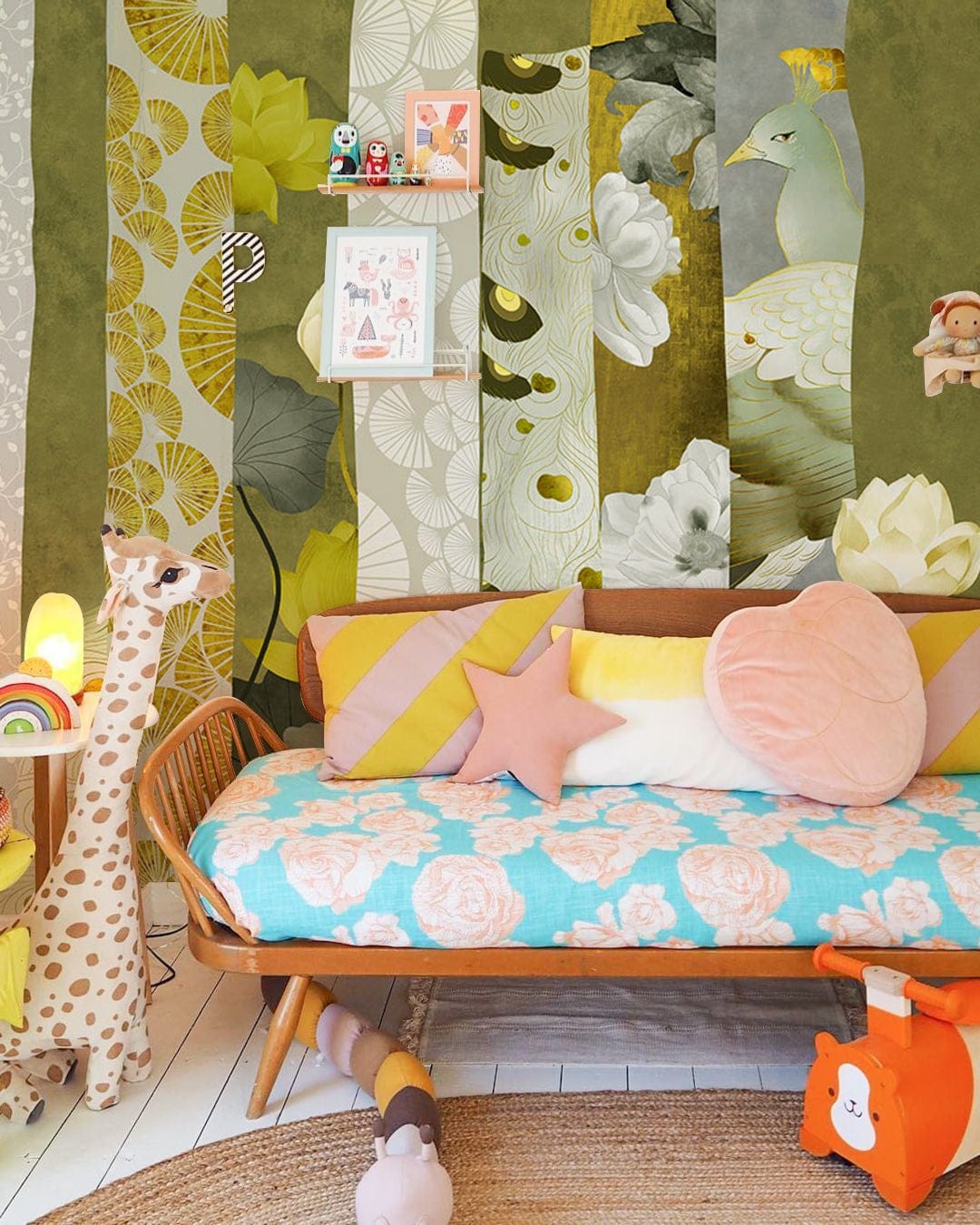The Art Deco II Wallpaper Mural exudes sophistication with its intricate pattern of stylised florals and elegant peacock feathers. Rich green hues blend seamlessly with soft gold accents, creating a luxurious tapestry reminiscent of the opulent Art Deco era. This mural's layered textures and calm yet striking colour palette make it an exquisite choice for any room, offering a timeless appeal that complements both classic and modern interiors.