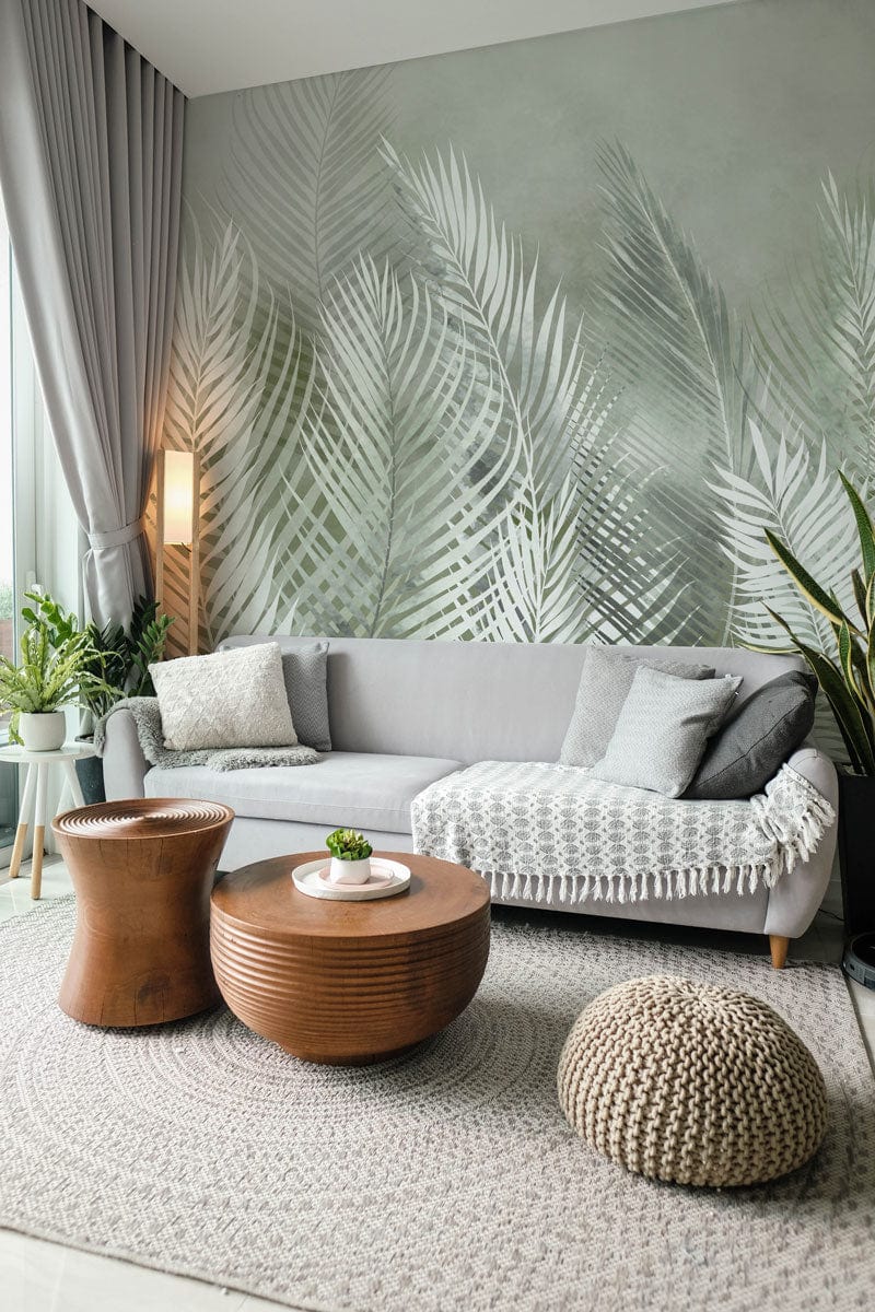 Immerse your space in the graceful allure of the Green Feather Leaves Wallpaper Mural, where delicately layered fronds create a serene, textured ambience. The artful arrangement of feather-like leaves against a soft backdrop offers a subtle blend of nature and artistry, making it a perfect fit for sophisticated interiors.