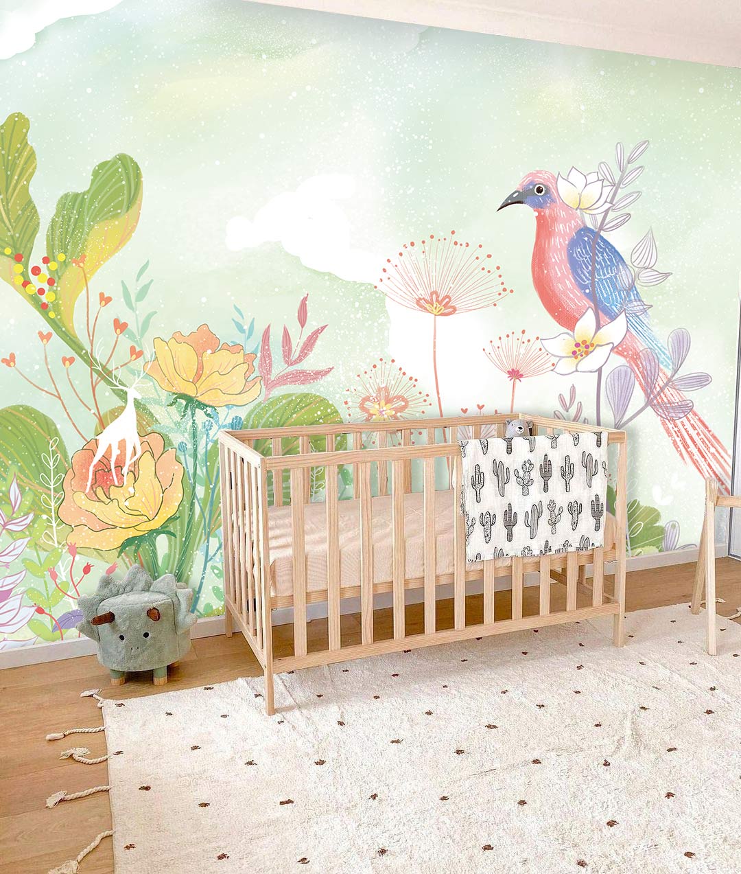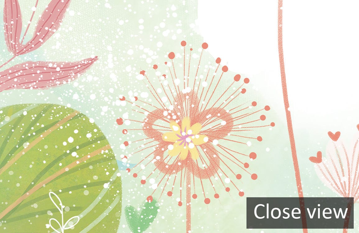 Dive into the simplicity and calmness with this design of a parrot between the flowers in a fantasy world. Feel the relaxation between the leaves and get yourself moments of peace with this mural wallpaper will make your place feel so relaxing and calm. The palette of the design is so light and the pastel colours give calm effect on the place and make is feel wider. This design is good for kids鈥?room and newborn because it will make them feel calm and have long deep sleep. This calming design is also perfect for your bedroom and will make you feel so relaxed and same if you used it in a living room and will make your guests feel so comfortable.