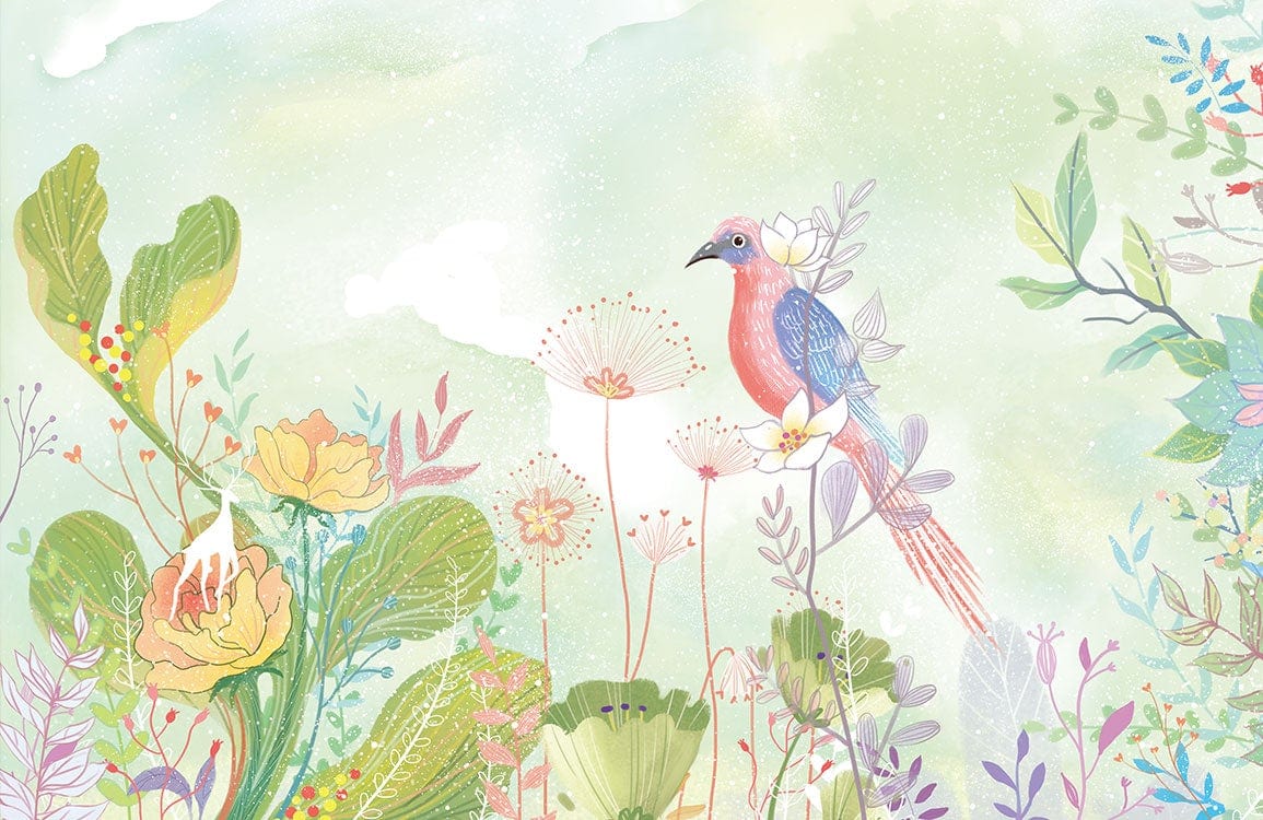 Immerse your space in a whimsical dreamscape with the Flower Fantasy Wallpaper Mural. Artfully designed, it depicts a vibrant bird perched amidst an enchanting garden of blooming flowers and delicate foliage. The intricate details and soft textures create a captivating scene that delights the senses and invites tranquility. Its harmonious design blends effortlessly into diverse environments, providing a timeless charm.