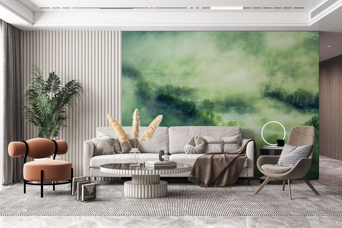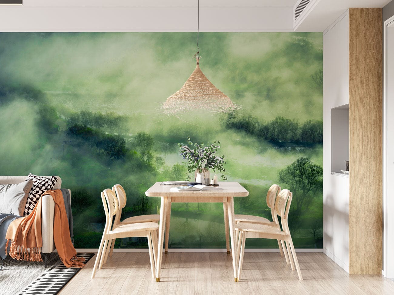 Immerse yourself in the serene elegance of the Green Foggy Forest Wallpaper Mural, capturing the enigmatic allure of nature shrouded in mist. Soft hues of green and grey evoke a tranquil ambience, while detailed textures of the forest create a sophisticated backdrop. This mural gracefully complements both traditional and contemporary interiors, offering a timeless piece that whispers of nature's gentle mysteries.