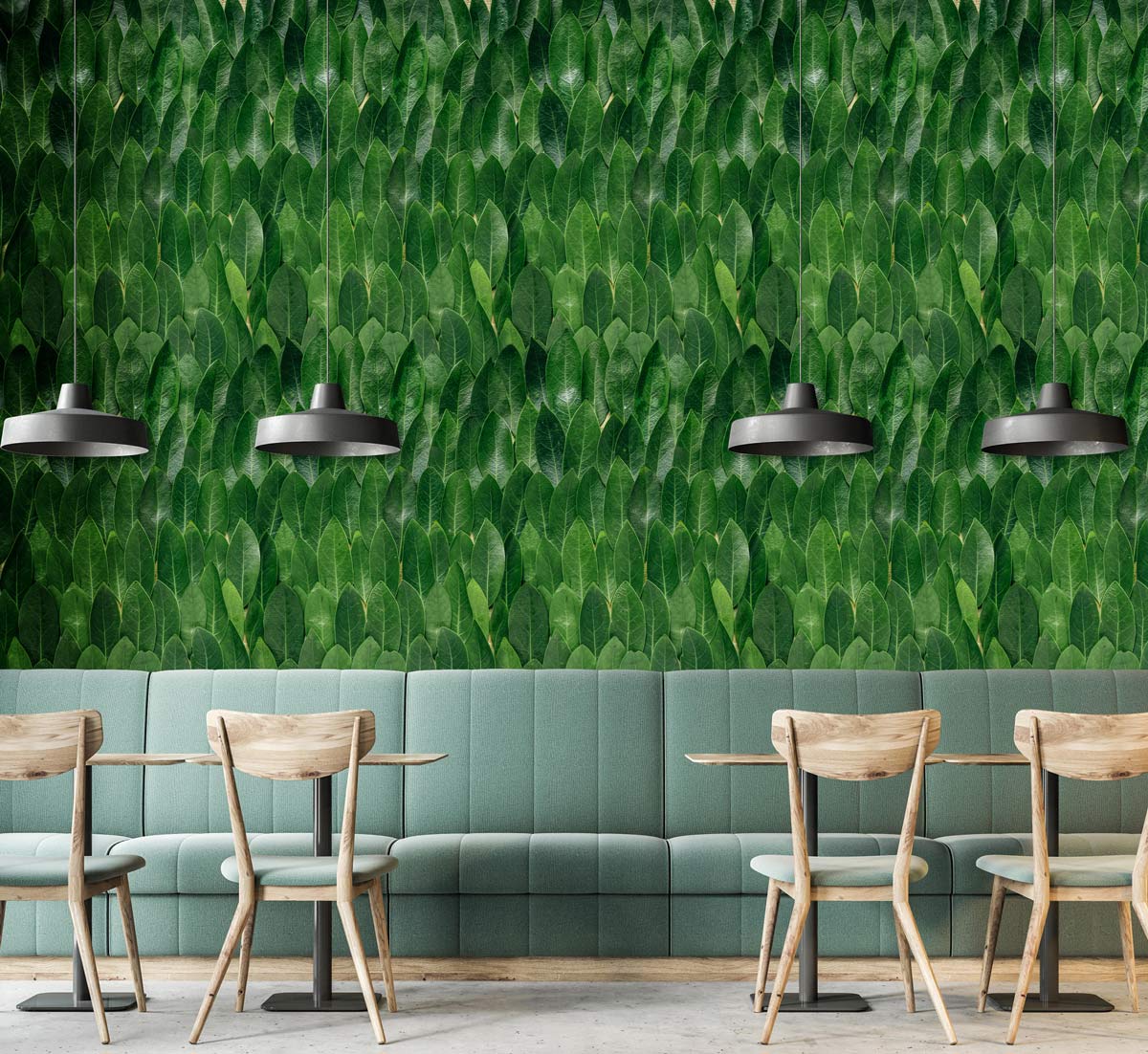 Bring nature close to you with this green leaves wallpaper mural. These fresh green leaves pattern design as a backdrop make a rather dramatic print and will surely make a nature and stylish statement in your home. This stunning green wallpaper will look amazing in your living room, bedroom or dining hall.