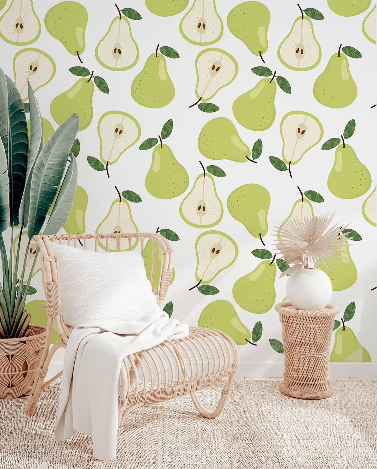 Feel the refreshment with these sliced green pears that will make your place look very fruitful and cool. The design is very refreshing and so eye relaxing. Enjoy this mural wallpaper with the fresh green pears pattern and give your place a new taste of modernity. This mural is perfect for living room, reading nook, kids鈥?room and also for kitchen. The design has very light shades of green that will make the vibes at the place so lite and relaxing. Design this wallpaper with white chiffon curtains for a very light effect and flowy view.