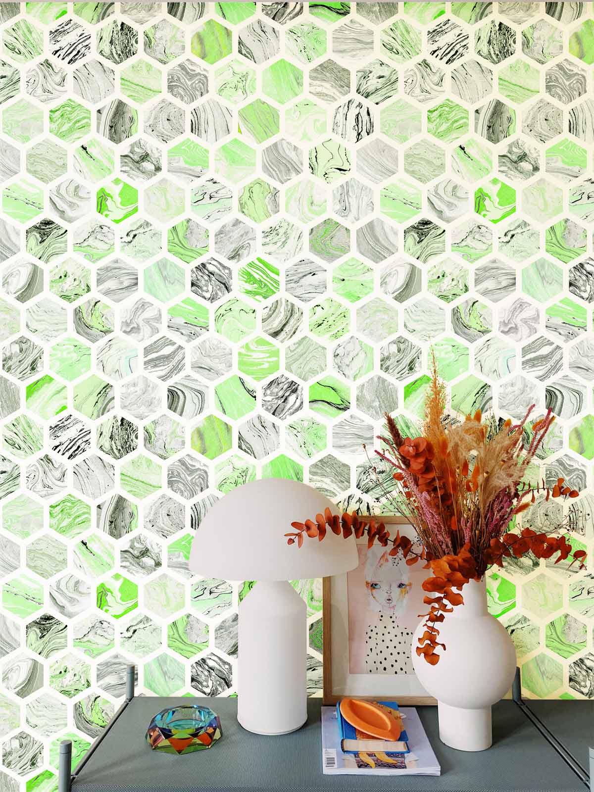 A space can be effectively given depth and intrigue by using the Green Hexagon Wallpaper Mural. Any home or office will look great with the hexagonal pattern's artistic and modern atmosphere. In addition to looking excellent in living areas, restaurants, and cafeterias, this geometric wall design聽is perfect for bedrooms or kids' rooms. This green聽wallpaper will undoubtedly serve as the centerpiece of your home, thanks to its modern appearance and feel.