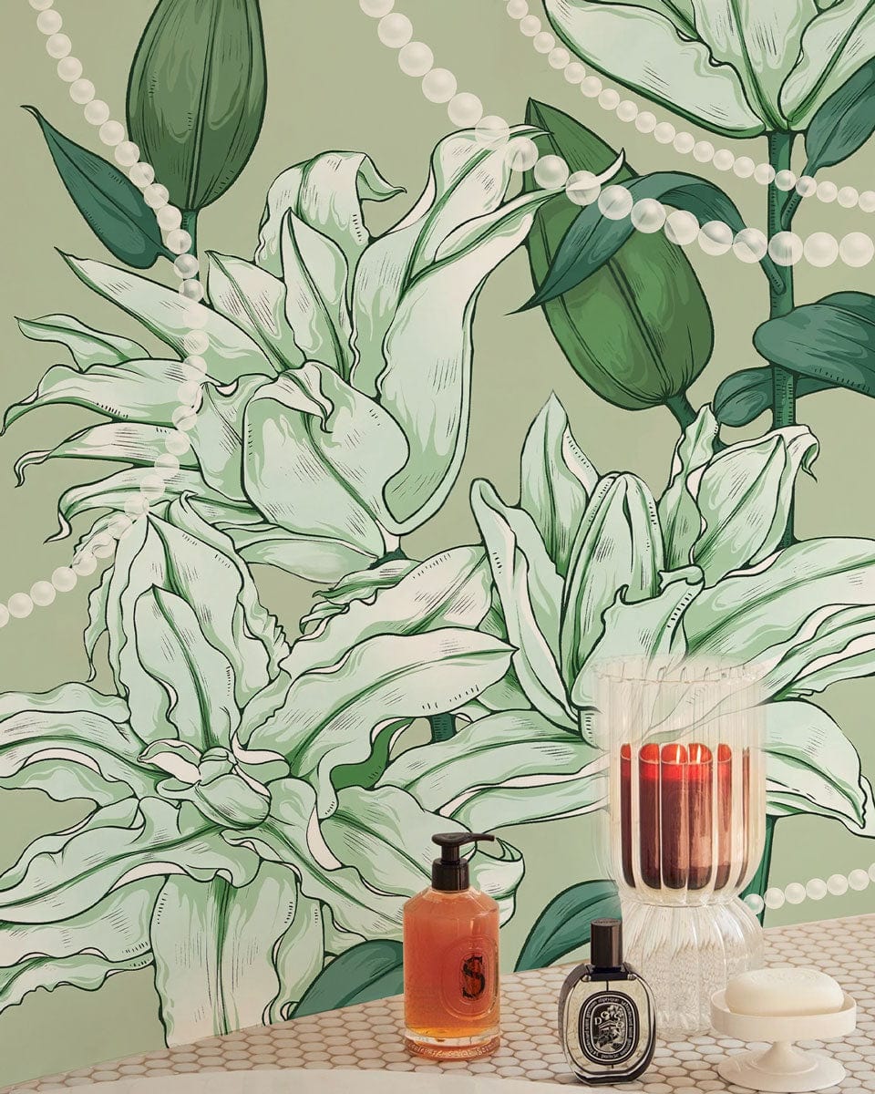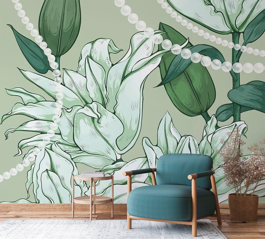 Immerse yourself in the delicate elegance of the Green Lily with Jewellery Wallpaper Mural, where intricate botanical illustrations gracefully intertwine with strands of lustrous pearls. The lush green hues of the lilies create an organic ambience, perfect for instilling a sense of serenity and luxury in any room. This sophisticated design offers a timeless appeal, blending effortlessly into classic, contemporary, or eclectic decors.