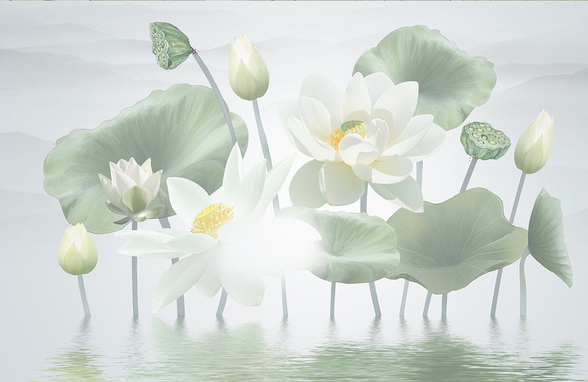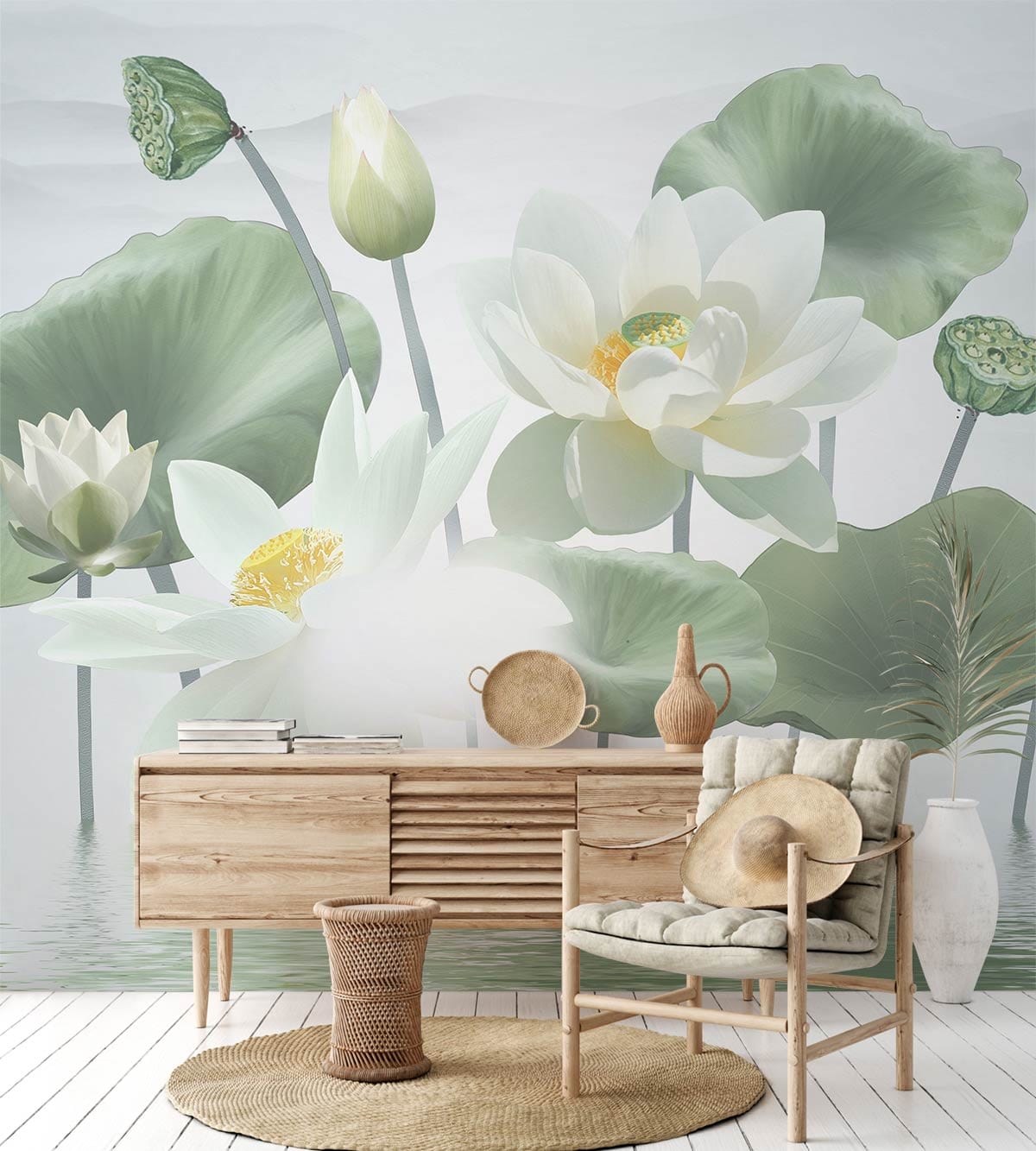 The Lotus in River Wallpaper Mural gracefully captures the serene beauty of blossoming lotuses floating gently on a mist-laden river. Delicate white petals contrast with the soft sage green leaves, creating a tranquil and sophisticated tableau that reflects nature's subtle elegance. This mural effortlessly complements a variety of spaces, exuding a timeless charm that enlivens minimalist, modern, and traditional interiors alike.