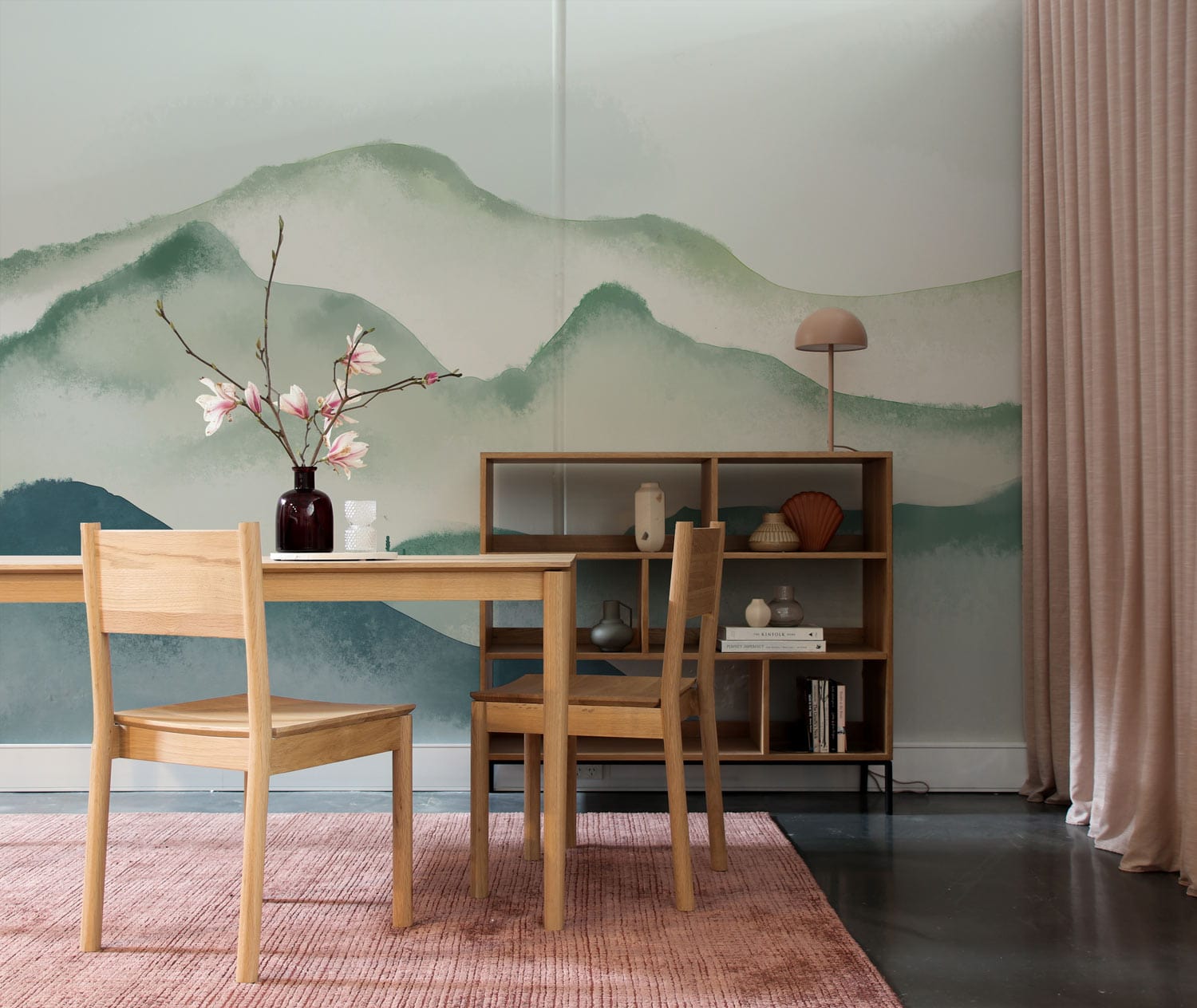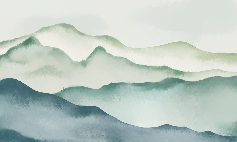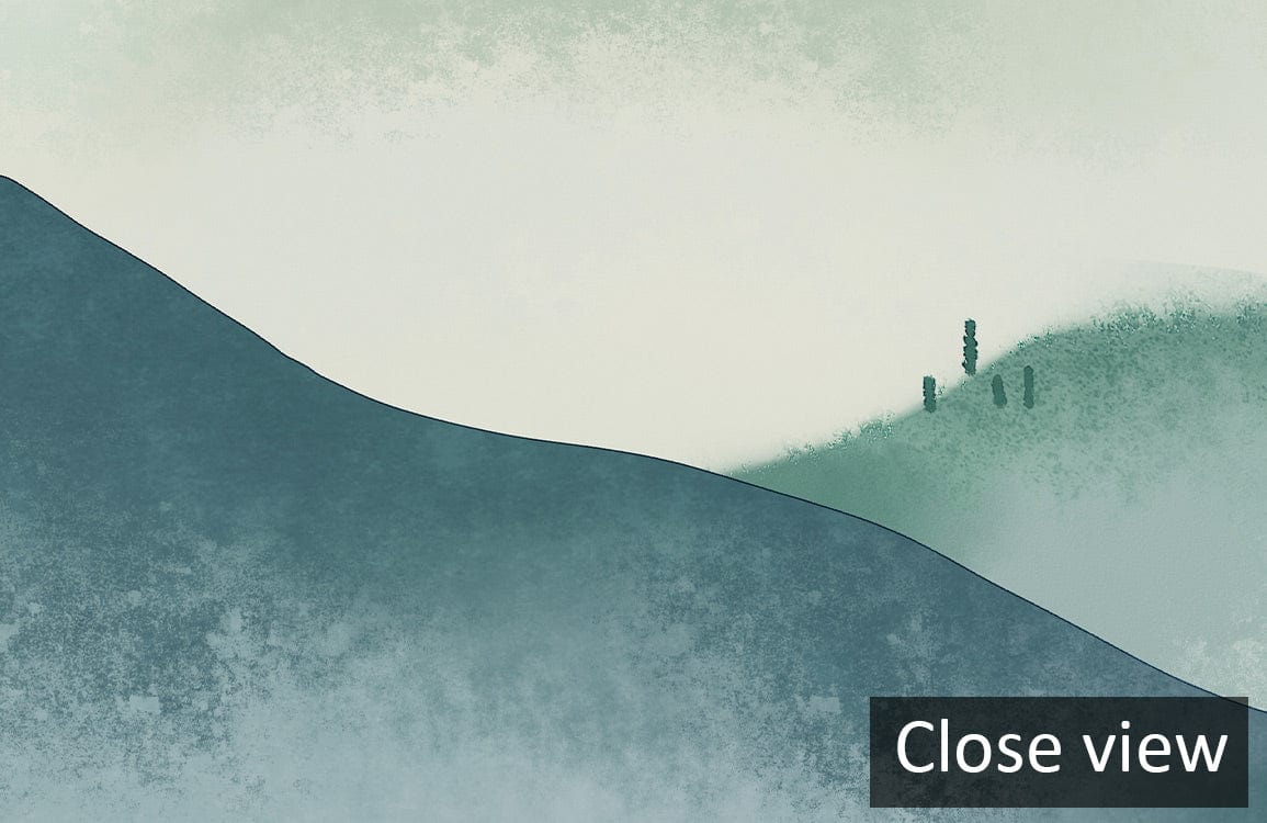 Create the perfect sanctuary for relaxing in your home with this Blue and Green Peaceful Mountainscape Wallpaper Mural. This bespoke wallpaper has been created by our in-house designer using creative water colour techniques, and this combined with the paper textures creates a design full of depth and intrigue. Level up your interior space with this water colour mountain painting wallpaper mural with Ever Wallpaper.
