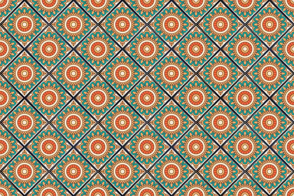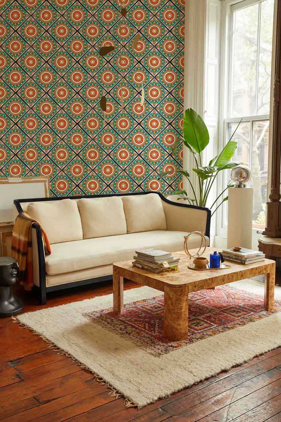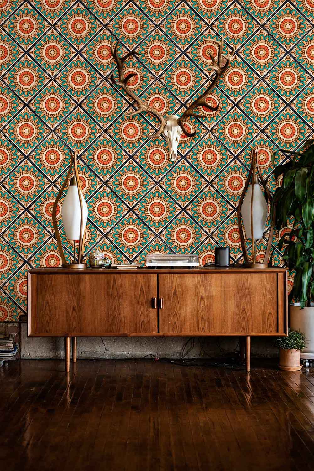Immerse your space in the captivating allure of the Green & Orange Vectors Wallpaper Mural. The intricate geometric pattern offers a dynamic fusion of deep green and vibrant orange, interwoven with delicate curves and lines that exude artistic elegance. This wallpaper's sophisticated design and rich colour palette provide a retro-modern charm, making it an exquisite fit for both classic and contemporary settings.