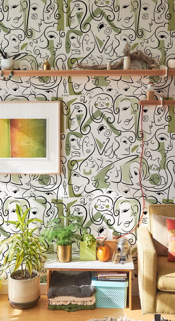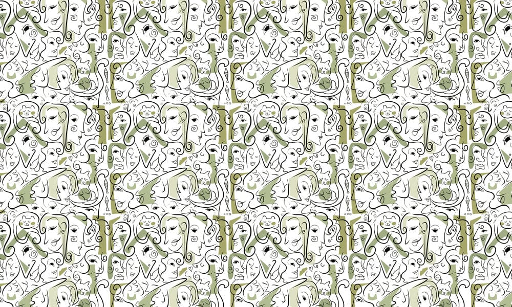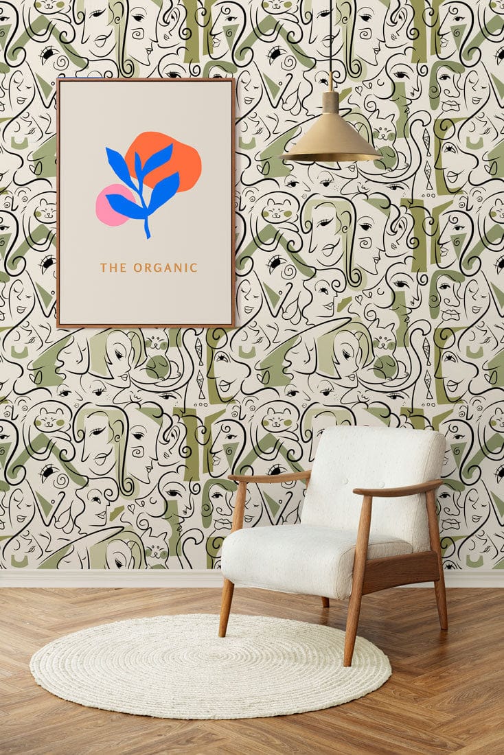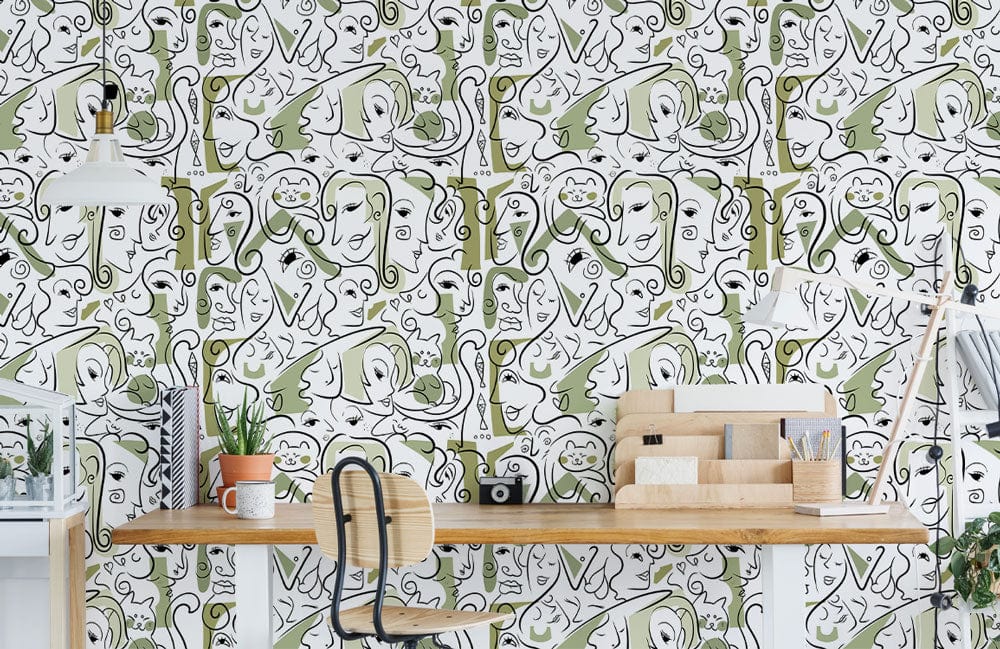 The Green Side Faces Wallpaper Mural presents an intricate tapestry of expressive visages delicately woven into an abstract landscape. Soft green hues blend seamlessly with understated whites and greys, creating a soothing yet sophisticated backdrop. This mural, with its artistic fluidity and subtle textures, finds harmony in both classic and contemporary settings, offering a dynamic visual that transcends trends.