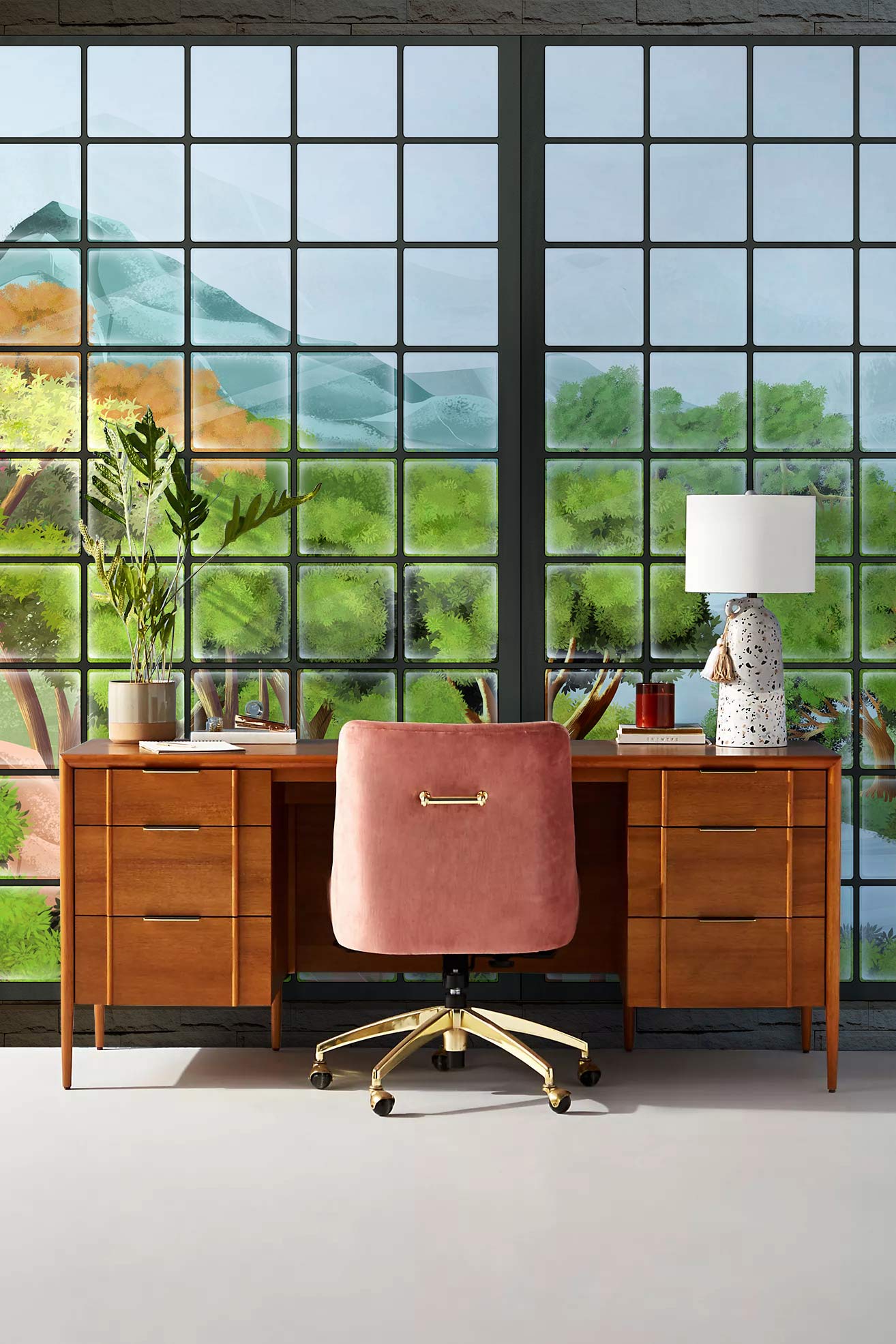 Immerse your space in the tranquil beauty of the Valley Wallpaper Mural, where lush greenery meets gentle mountain silhouettes. This exquisite design effortlessly captures the serene interplay of nature's elements, bringing an artful ambiance to your home. Its delicate brushstrokes and harmonious palette provide a sophisticated backdrop, suitable for any setting seeking timeless elegance.