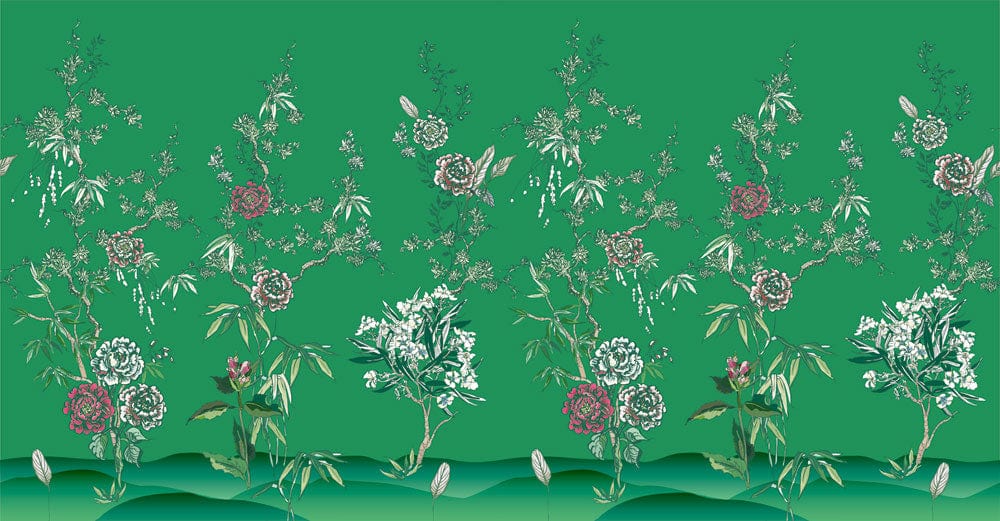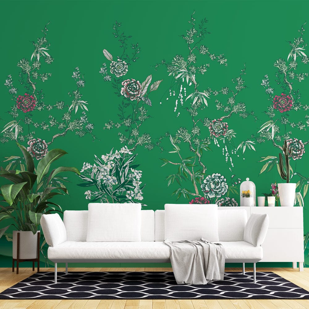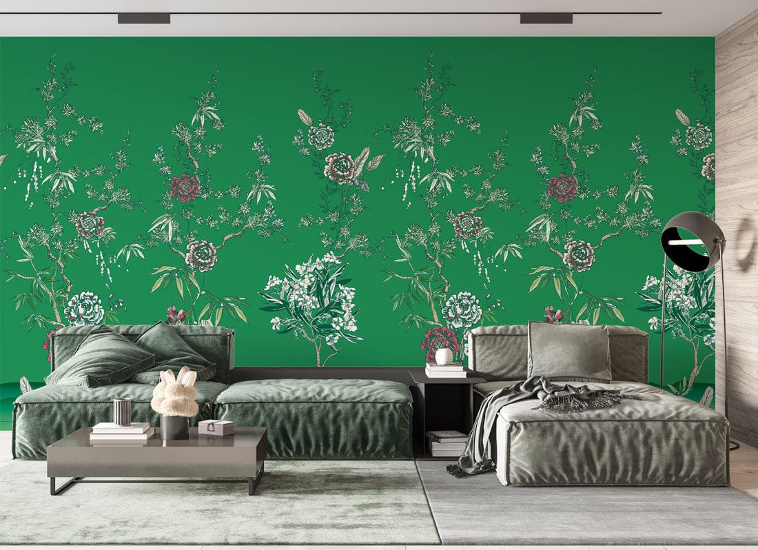 The Green Verdant Elegance Mural Wallpaper boasts an intricate design of blossoming botanicals set against a rich emerald backdrop. Delicate florals and lush foliage intertwine with artistic finesse, creating a serene tapestry that evokes a refined natural elegance. Its timeless appeal makes it an exquisite choice for adding a sophisticated touch to both contemporary and classical interiors.