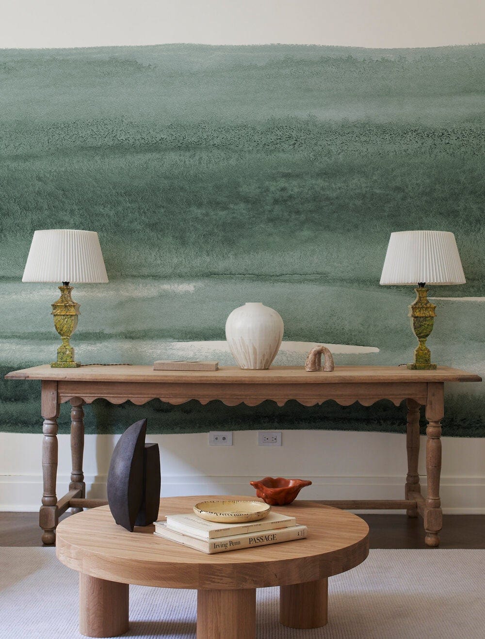 With its serene waves of green, this watercolour wallpaper mural exudes sophistication and timeless charm. Soft, natural strokes create a seamless blend of artistry and elegance, making it an exquisite choice for any interior. The mural's subtle textures evoke a tranquil atmosphere, ideally suited for spaces seeking a touch of refined artistry.