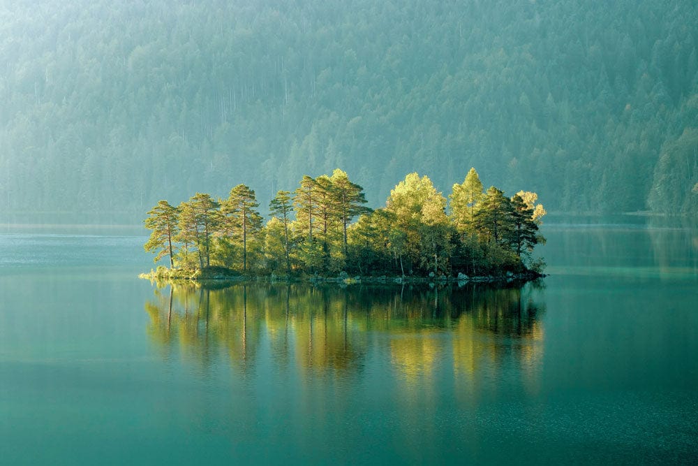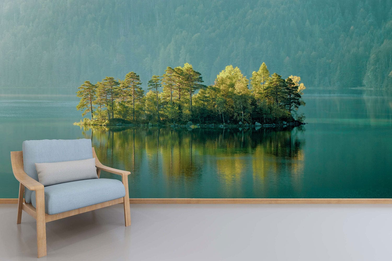Immerse your interior in tranquillity with the Greens on Lake Wallpaper Mural, featuring an elegant scene of a serene island mirrored in pristine waters. This mural captures the ethereal beauty of lush green foliage against a backdrop of misty, forested hills, inviting a sense of peaceful sophistication. Its meticulous attention to detail and texture make it a perfect complement to any room seeking a touch of natural elegance and serenity.