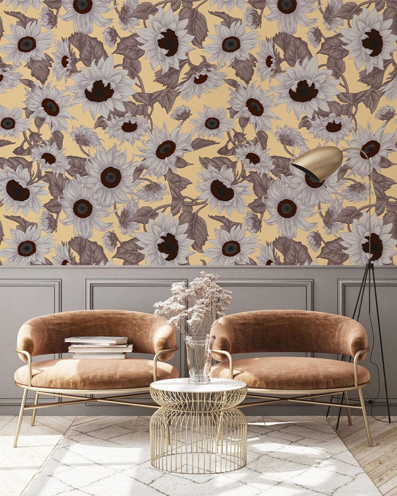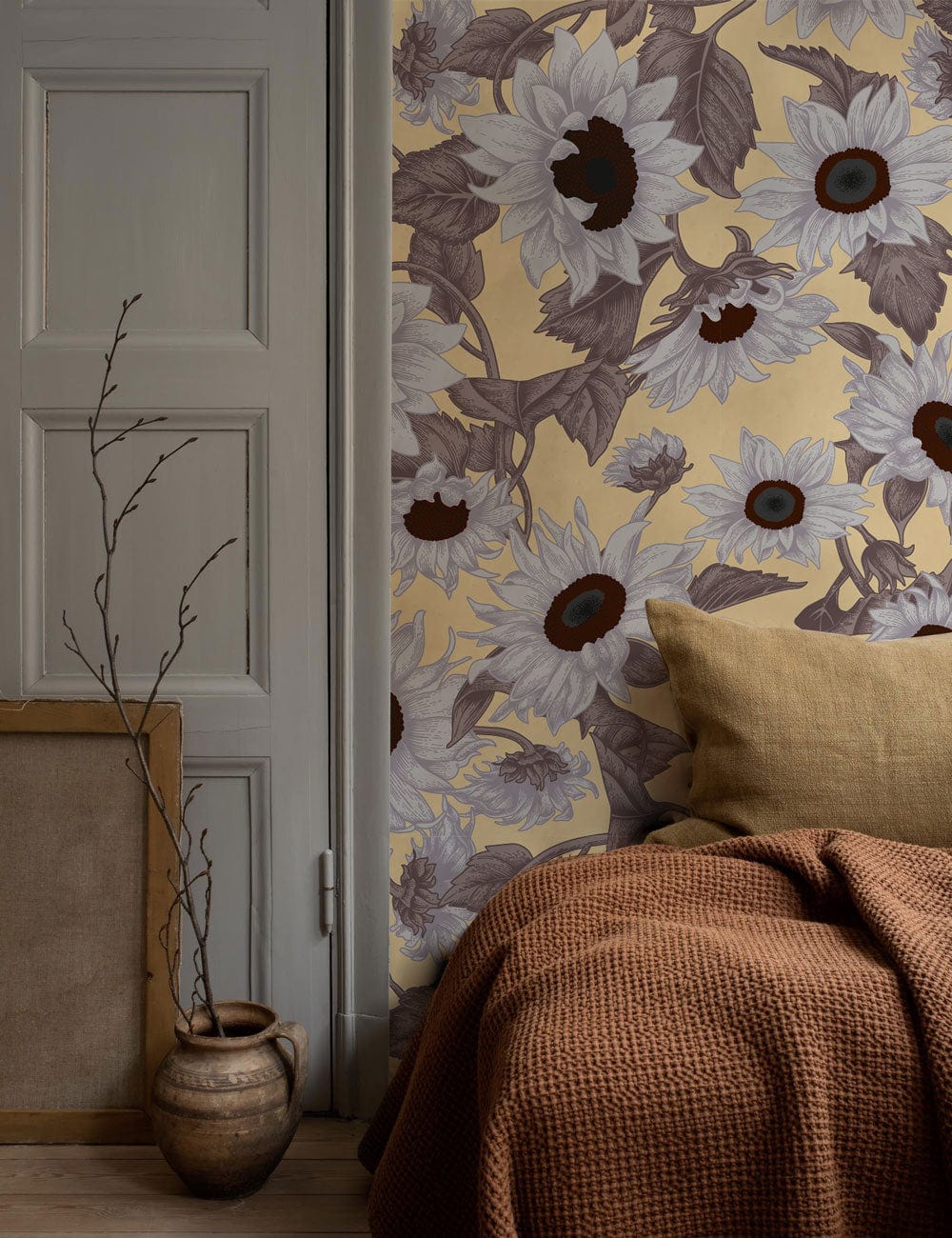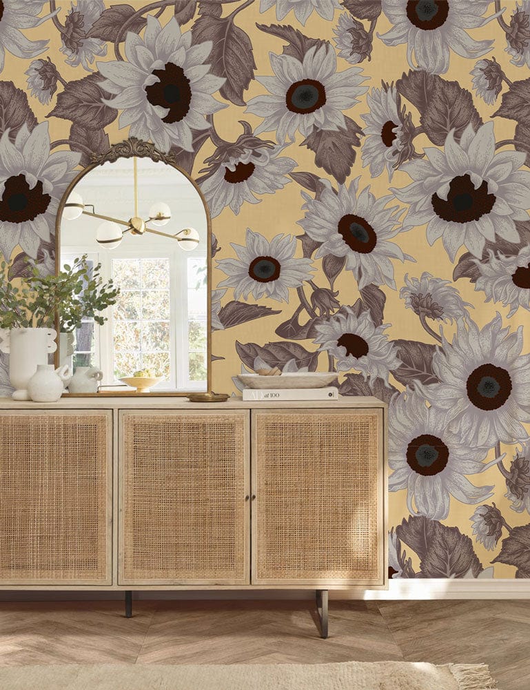 The Grey Daisies Wallpaper Mural introduces an exquisite floral pattern with its delicate daisy motifs set against a muted yellow backdrop. This sophisticated design brings natural beauty and timeless charm into any space, seamlessly blending with both vintage and contemporary interiors. The detailed artistry and soft tones create an inviting atmosphere, making it a perfect choice for those seeking a subtle yet refined decorative statement.