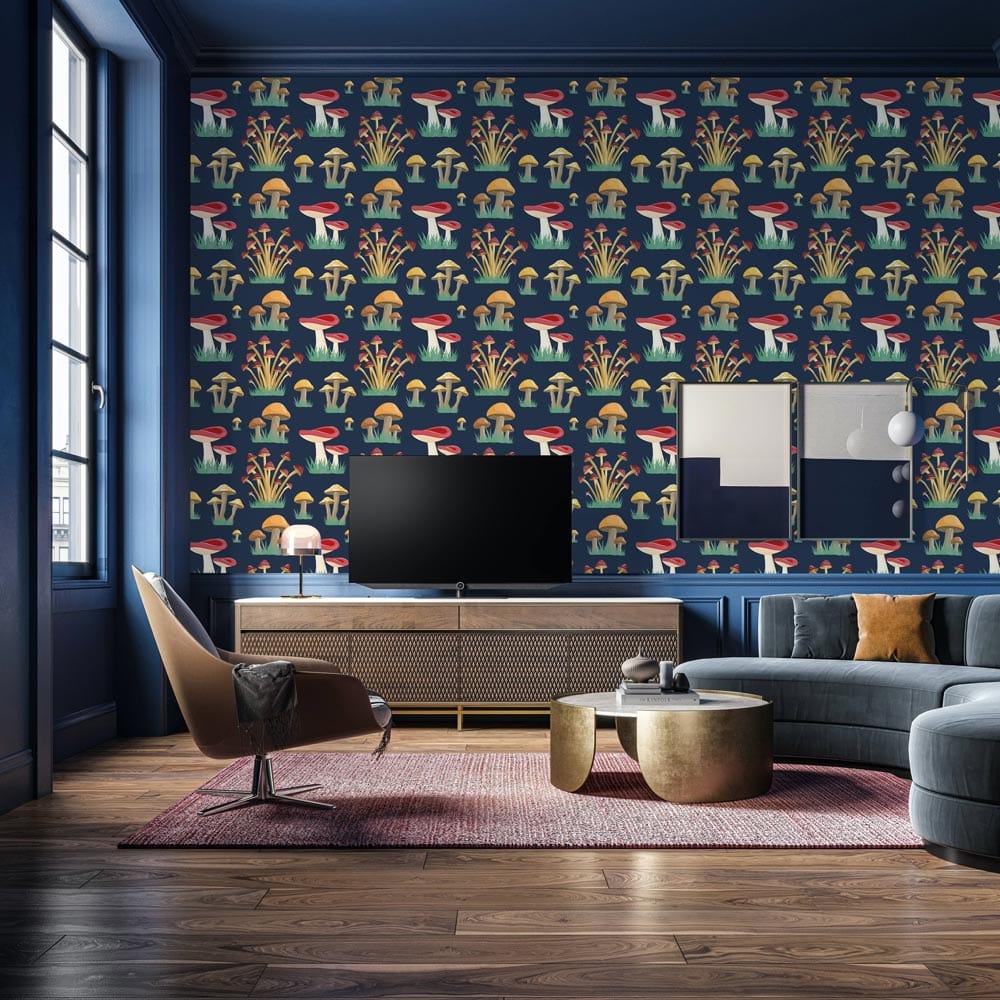The Growing Jasper Mushrooms Wallpaper Mural presents an artful tapestry of intricately detailed fungi and grasses, evoking a whimsical woodland. The interplay of deep blue and earthy tones creates a rich texture that infuses a sense of serenity. This mural's nature-inspired elegance suits both contemporary and traditional spaces, enveloping interiors in a timeless charm.