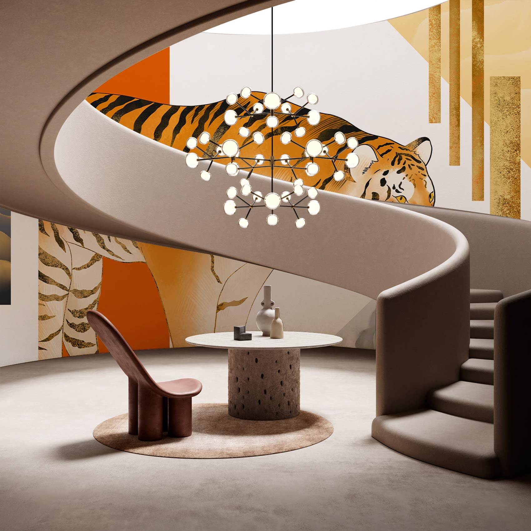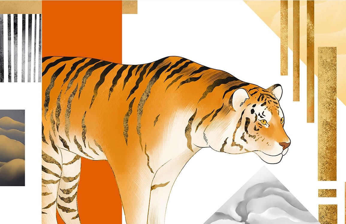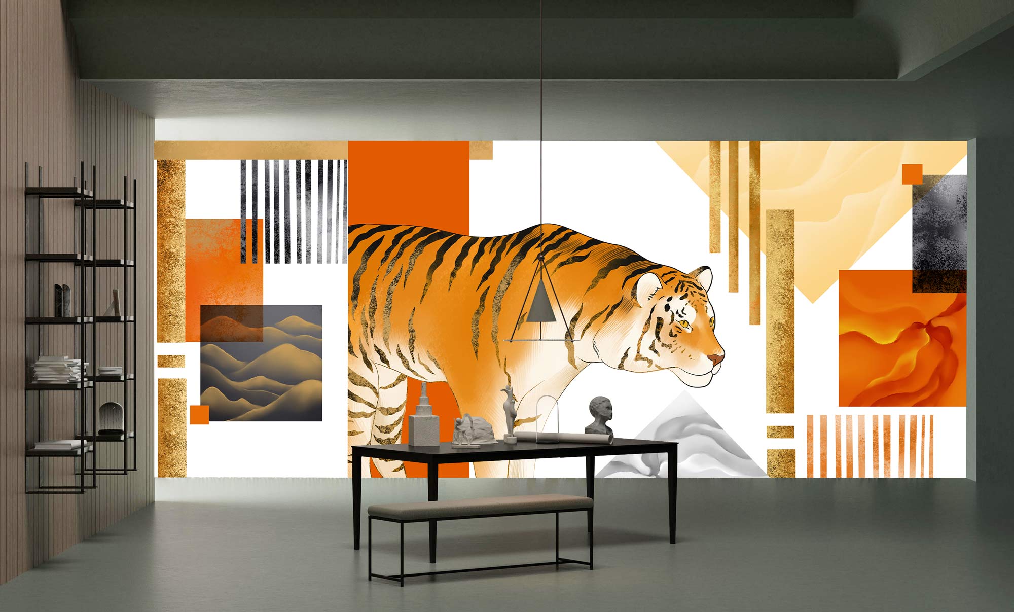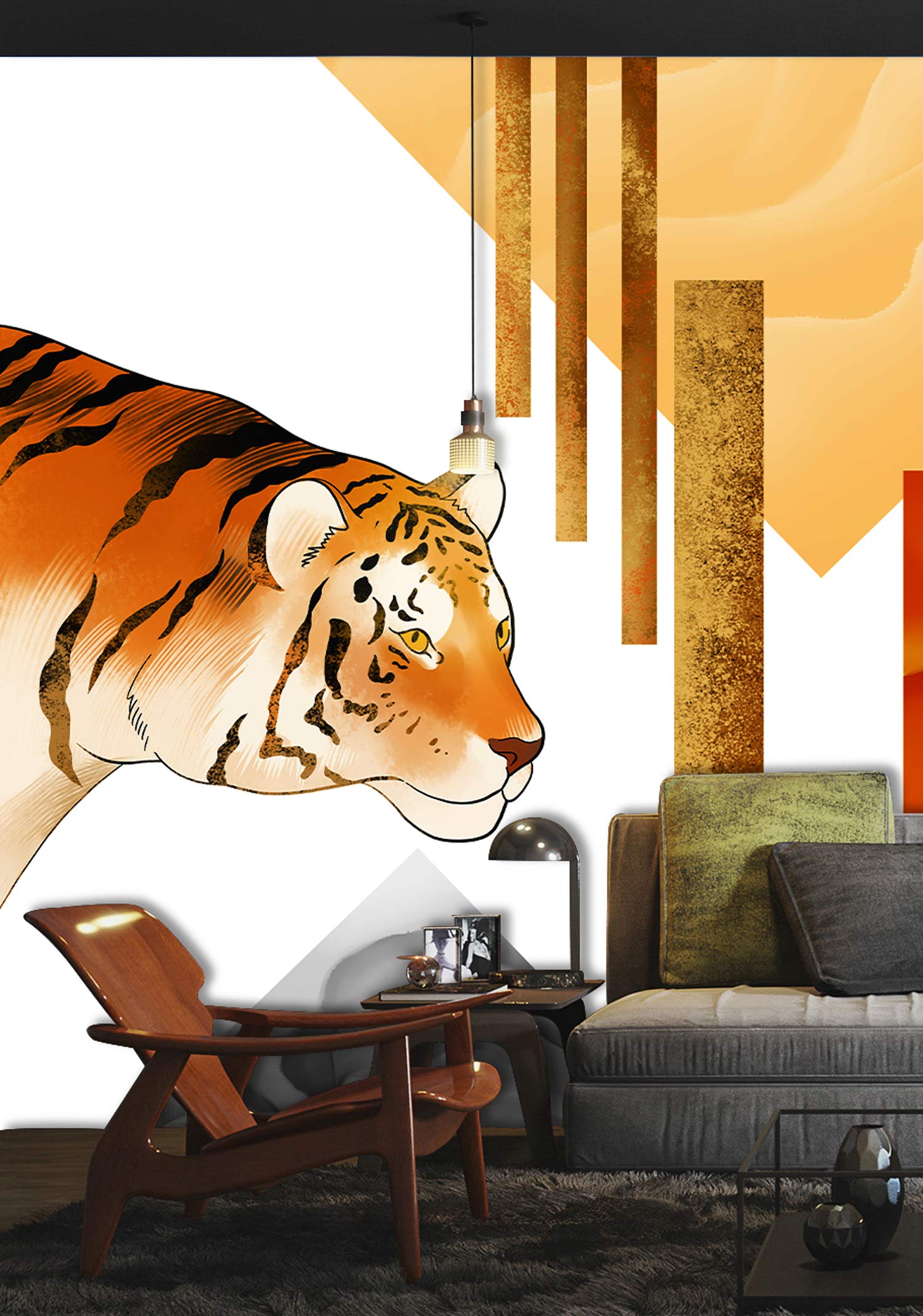 Dive into the wild elegance of the Tiger Wallpaper Mural, where artistry meets nature in a striking visual narrative. The design captures a poised tiger amidst geometric patterns, blending bold orange hues with soft greys and gold accents. This mural enriches any space with a sense of sophistication and dynamism, effortlessly complementing a variety of interior themes.