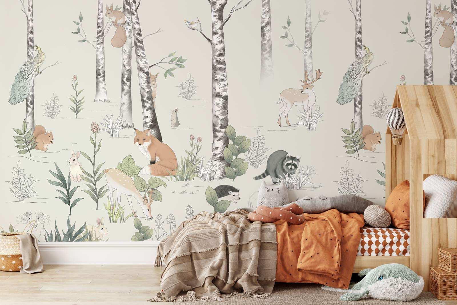 Easily bring a beautiful forest theme to a child's bedroom or nursery with our hand-paint wallpaper mural. This wallpaper is a hand-painted design featuring some of the adorable animals in forest, such as the deer, rabbit, fox and raccoon in soft pastel tones. Little ones will be amazed with this wildlife scene as a feature wall in their room. Bring out the curious side of your kids with a nature-filled wall design that they'll cherish while they grow.