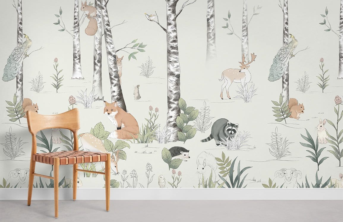Immerse your interior space in the charming elegance of a tranquil woodland scene with this Forest Animals Wallpaper Mural. Featuring artfully illustrated woodland creatures nestled amongst birch trees and delicate foliage, the design boasts a narrative richness and whimsical allure. Perfectly detailed, it exudes a serene sophistication, creating a harmonious backdrop suitable for an array of décor styles.