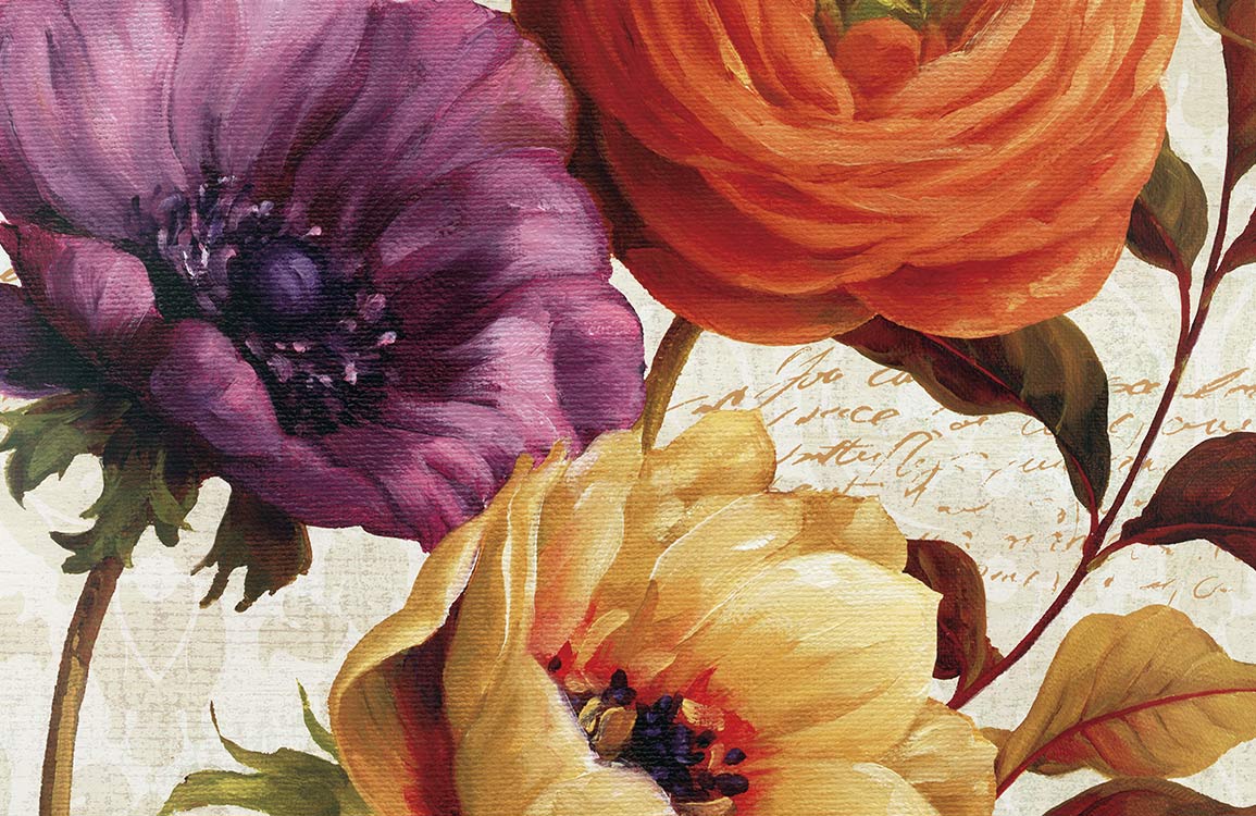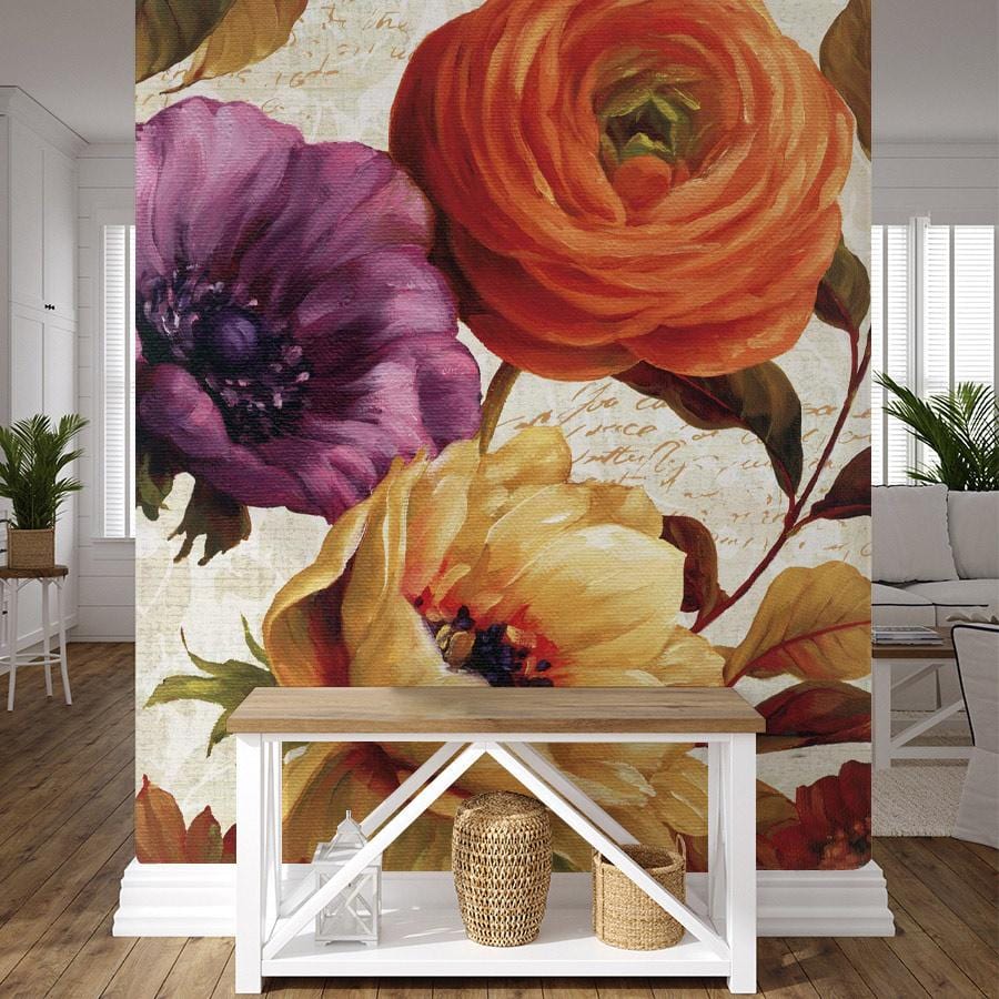 Immerse your interiors in the sophisticated charm of the Harmonize Wallpaper Mural, where vivid blossoms of lilac, amber, and marigold dance across a gentle parchment backdrop. The exquisite artistry captures every petal's detail, bringing a gallery-like sophistication to your space. This stunning composition enriches any room with its timeless appeal, adaptable to both classic and contemporary settings.