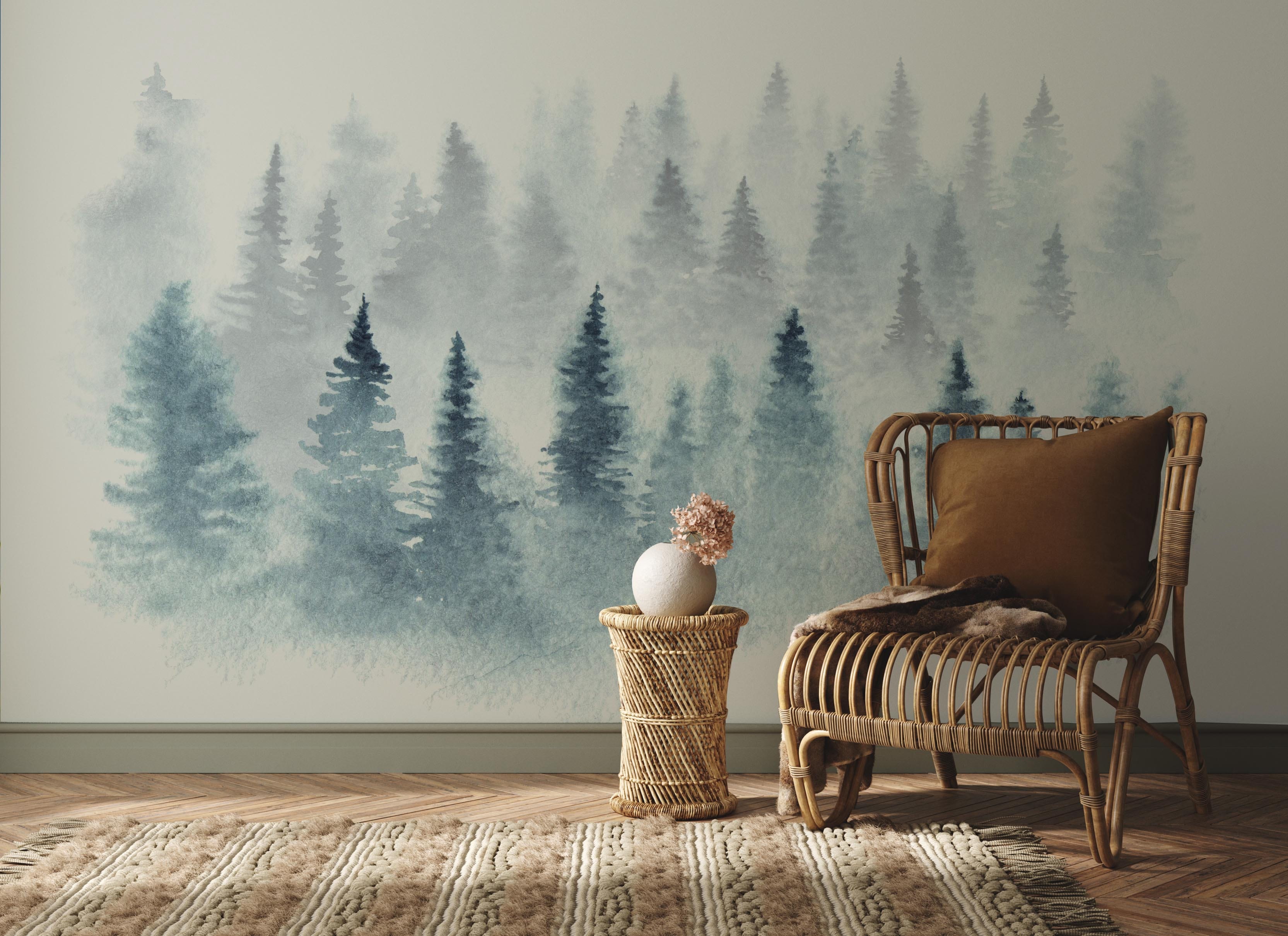 Get lost in this dreamy wood forest with our hazy wood wallpaper mural. This turquoise water colour pine tree woods wallpaper will surely make a big influence on your interior spaces. The water colour painting technique used to realize this design brings the depth of a real forest to the mural with the brilliance of the various green tones.Create an misty effect in your bedroom, bathroom, living room and hallway.