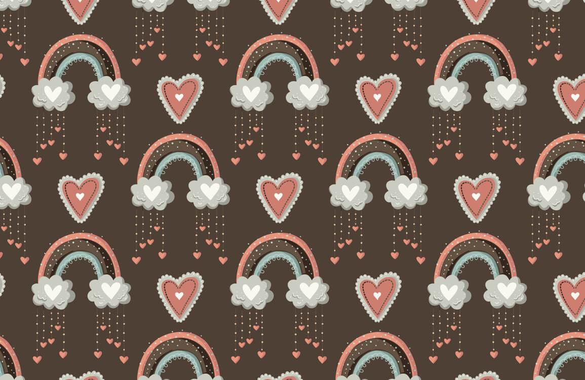 Create an appealing space with this heart and rainbow wallpaper mural. This heart and rainbow pattern graphics with chocolate brown background creates a cute and tasteful feeling to the interiors. Bring cheer to your kid's room with an instant revamp with this adorable design. Perfect for your child's room or the baby nursery room.