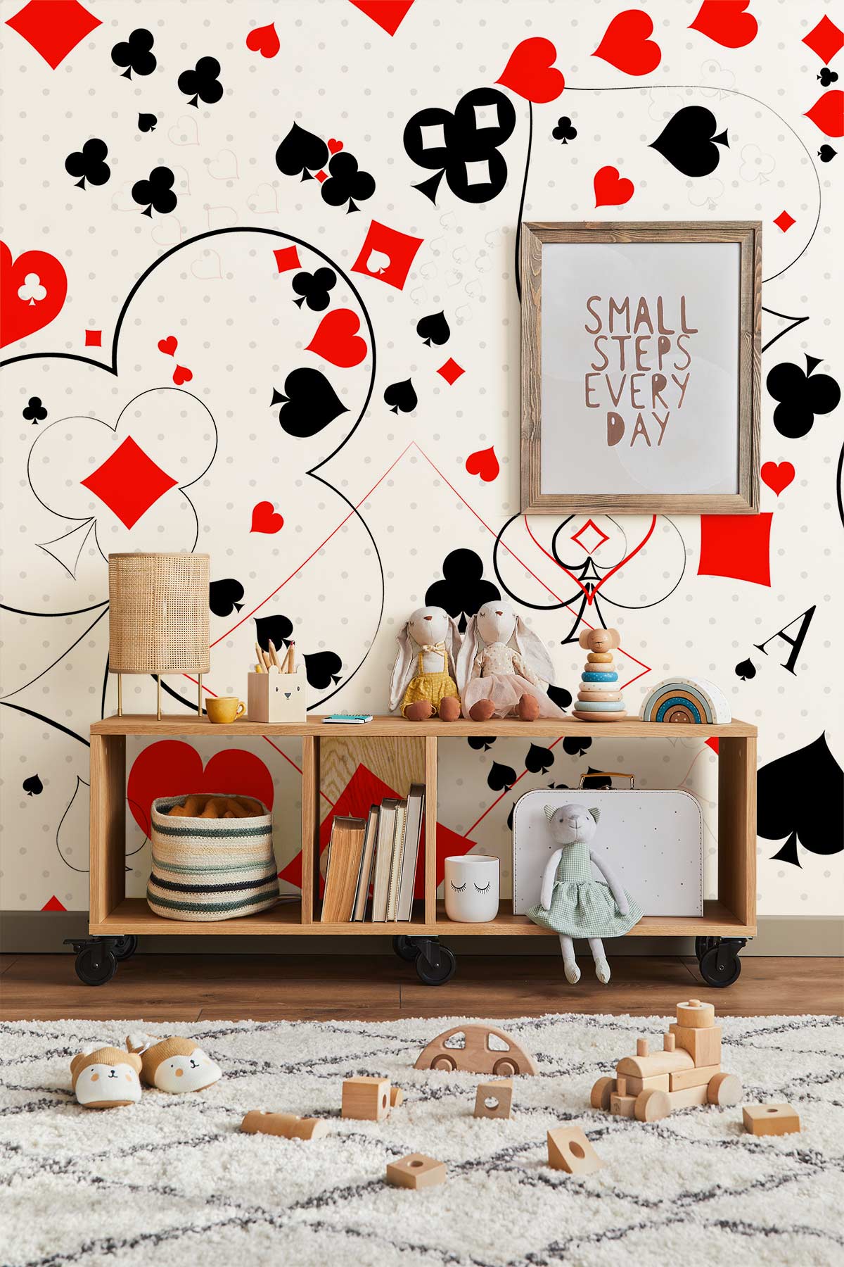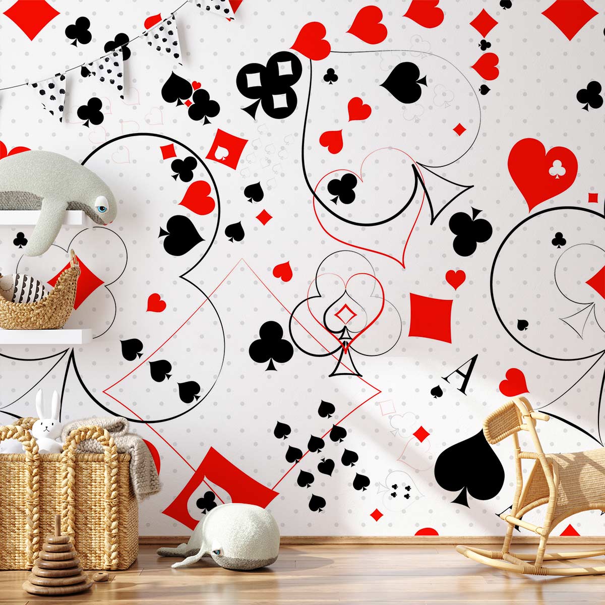 Introducing the Hearts Poker Wallpaper Mural - a mural wallpaper with a poker cards design that will transform the decor of your home interior. Whether you are an avid poker player or just looking for something fun to make your home or office more exciting, this vintage-looking wallpaper mural will bring the excitement of poker into any room in your house or office. With fun and colourful card shapes, this is a great way to create a little whim in your everyday life.