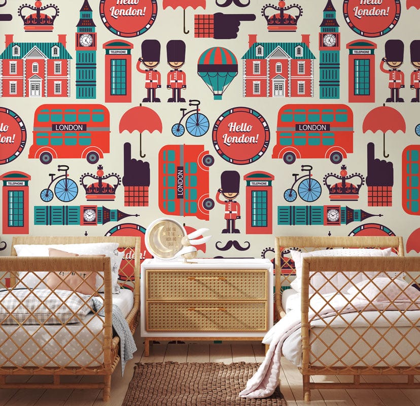 Discover an artful homage to England's capital with the Hello London Wallpaper Mural, where iconic landmarks and quintessential motifs dance across a vintage-inspired canvas. The interplay of bold colours and charming illustrations creates a tableau that evokes nostalgia, yet suits the contemporary eye. Perfectly capturing the spirit of the city, this wallpaper fits various settings seamlessly, from lively lounges to sophisticated studies.