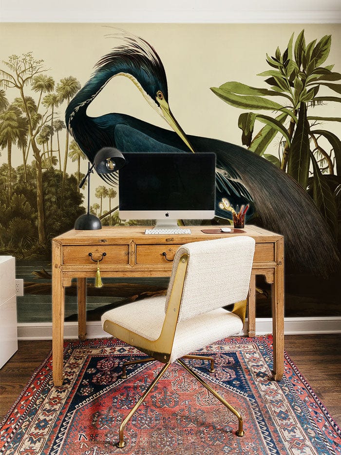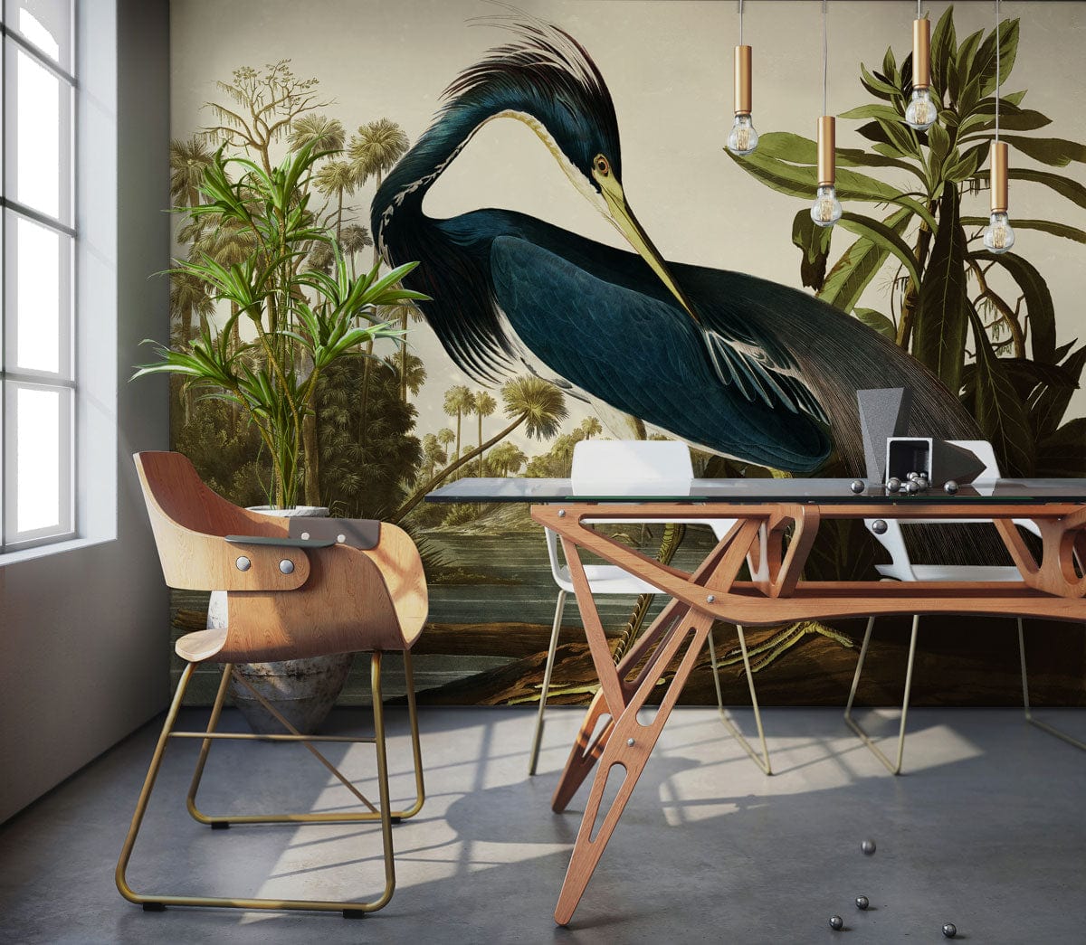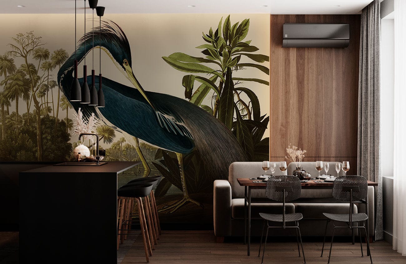 This blue heron wallpaper mural is ideal decor to use as a background. This beautiful, amazing painting of a large blue heron in the forest will be perfect for the indoors in your home. Interesting rendering with a natural atmosphere and a refreshing wall decoration perfect for any day and affable name: creatures with green scenes.