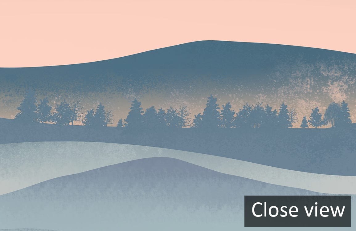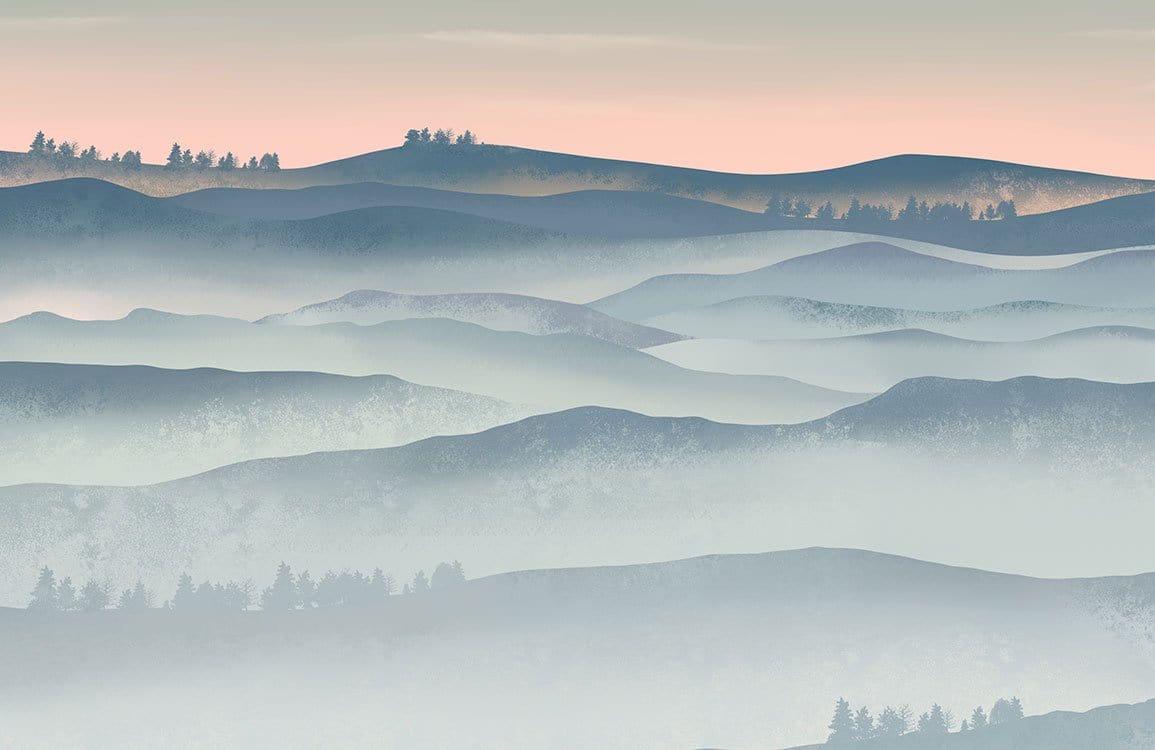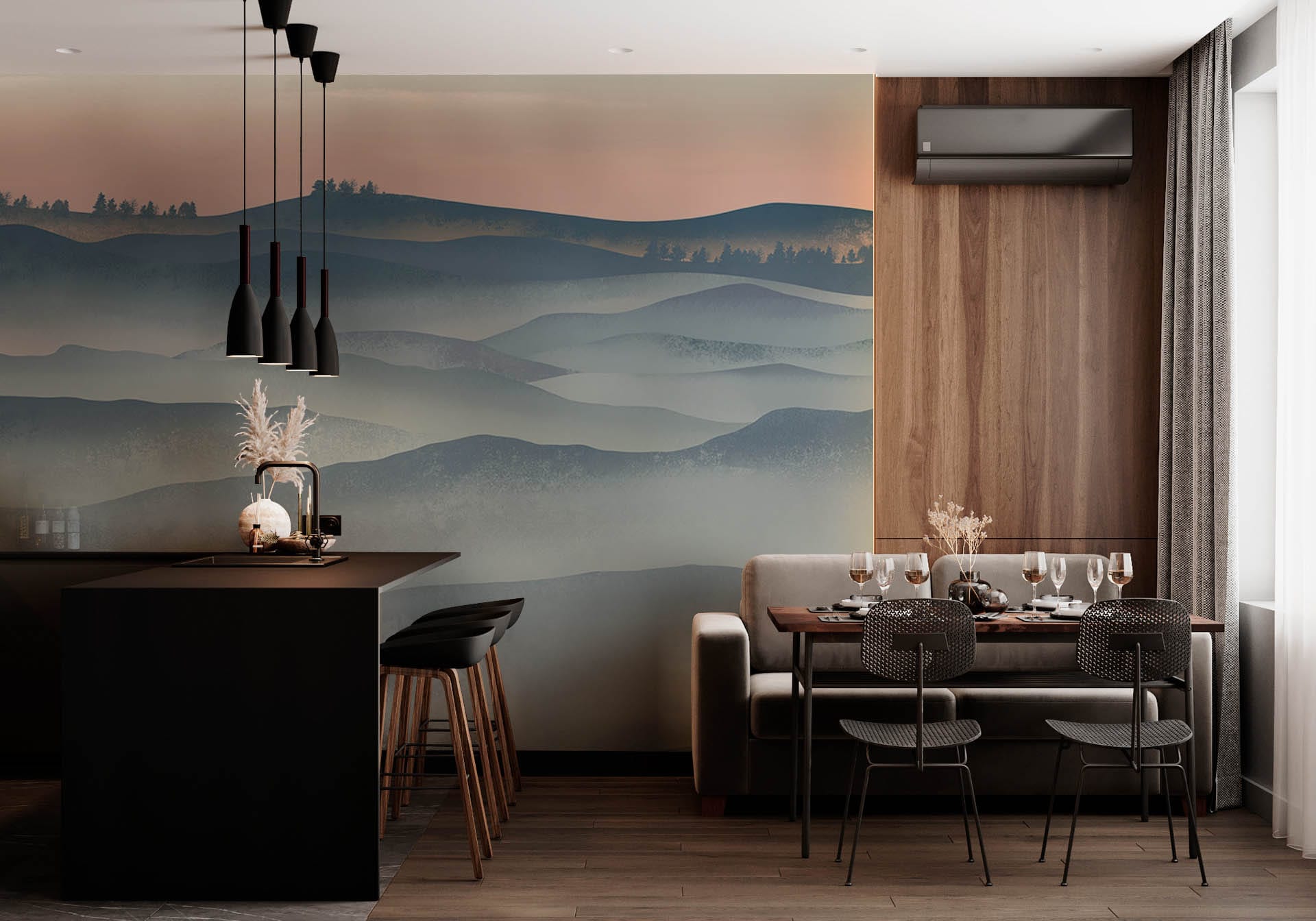 Immerse your space in the tranquil beauty of the Hill Scene Wallpaper Mural, where rolling misty hills and subtle tree silhouettes blend harmoniously. The delicate interplay of soft blues and warm pastels creates a serene landscape that breathes sophistication into any room, offering a timeless backdrop for both classic and contemporary interiors.