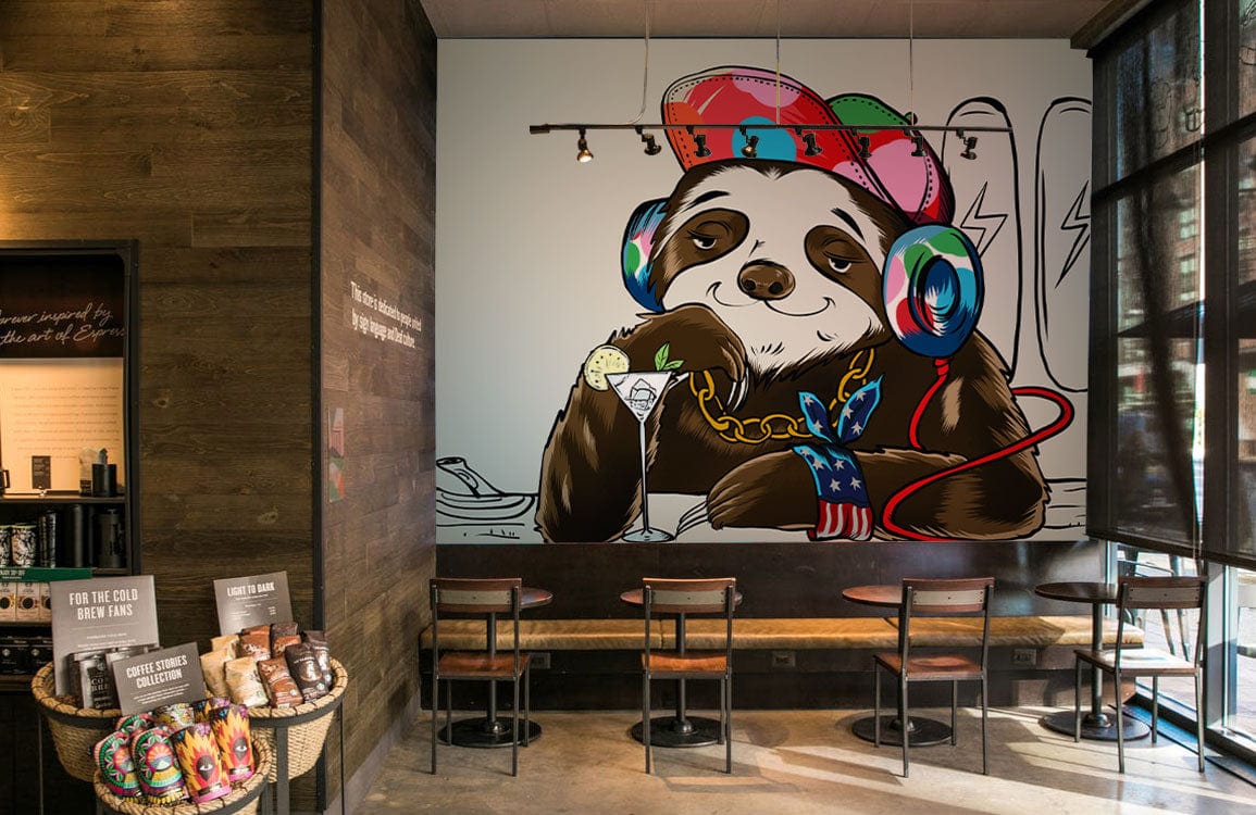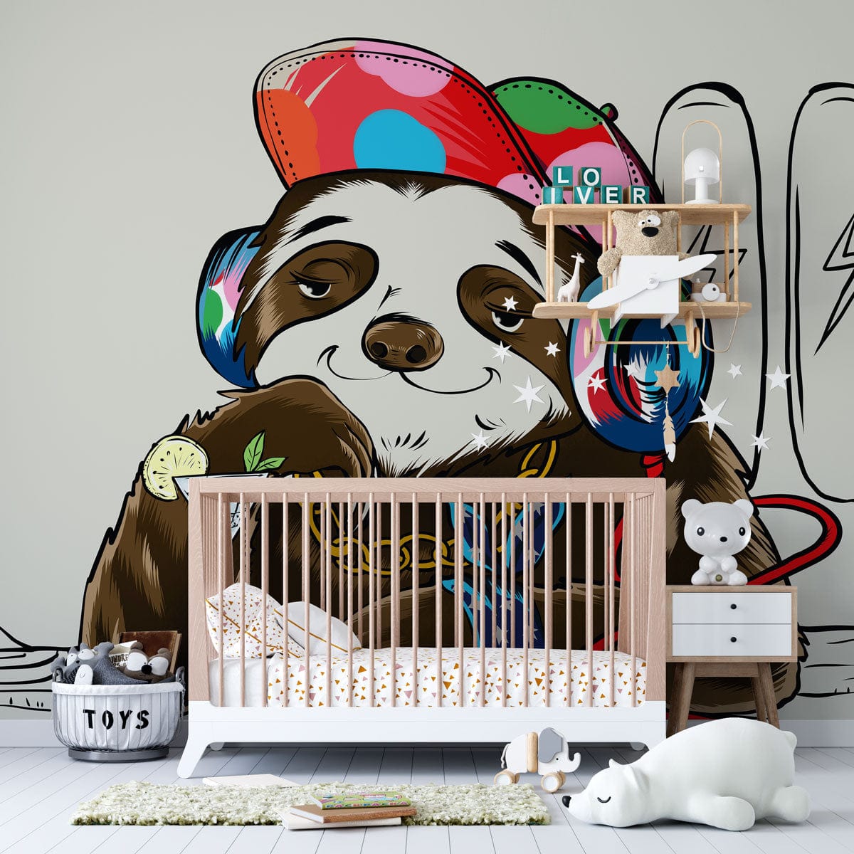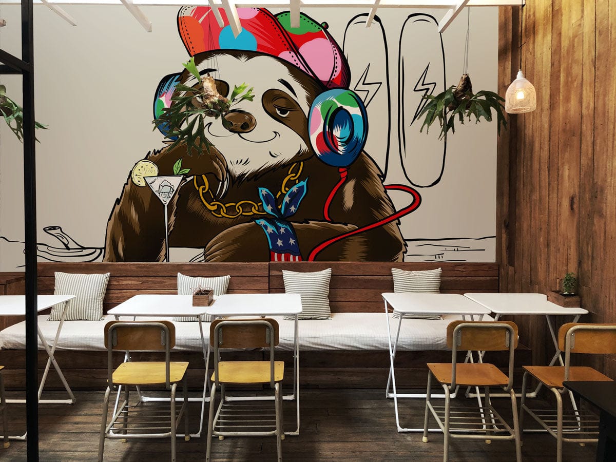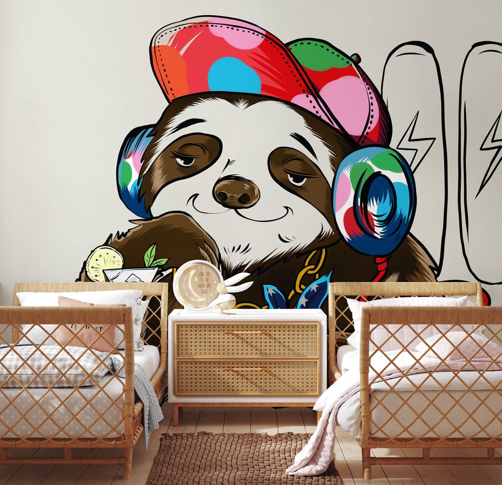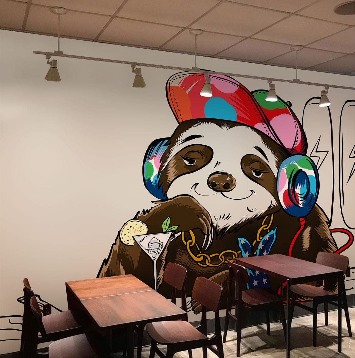 Introduce an element of quirky sophistication with the Hiphop Sloth Wallpaper Mural. This playful design features a relaxed sloth donning vibrant headphones and a cap, sipping a cocktail. Its whimsical charm adds personality, making it a captivating focal point in both contemporary and casual interiors. The mural's unique artistic details and lively composition offer a visual delight that seamlessly integrates into various settings.