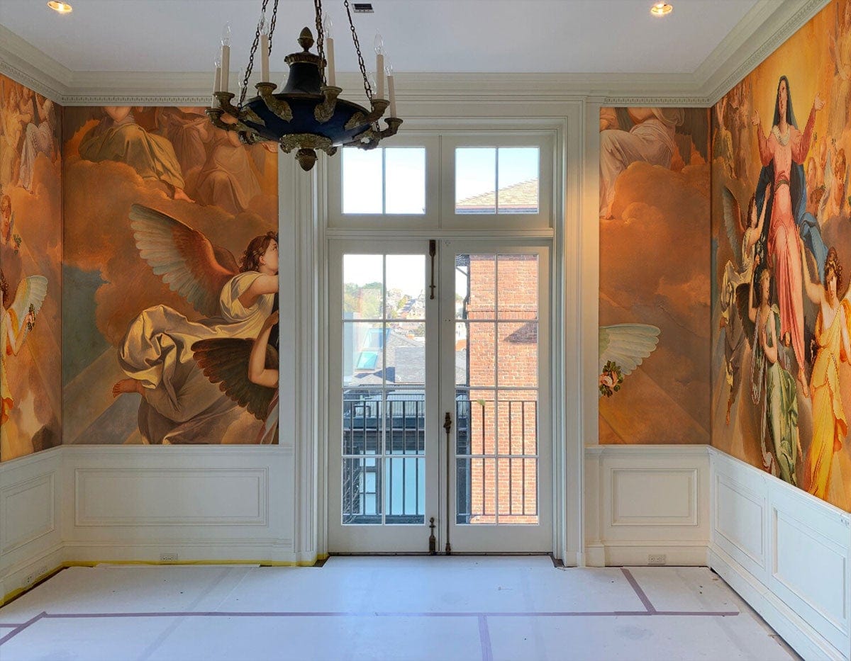 The Homilies Archivos Wallpaper Mural offers a captivating portrayal of celestial elegance, featuring exquisitely detailed figures surrounded by luxurious clouds. With its rich textures and graceful drapery, this mural seamlessly integrates classical charm with a serene atmosphere, making it a distinguished addition to any space.