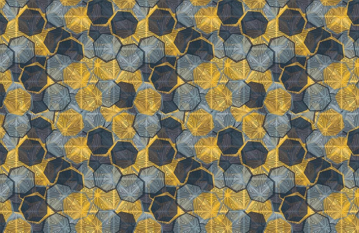 Immerse your space in the captivating geometry of this honeycomb-shaped wallpaper mural. Intricately designed with interlocking hexagons, it weaves together subtle textures and intricate patterns. The blend of gold and deep blue creates a harmonious balance that invites a sense of sophistication. Ideal for layouts that demand an artistic touch, this mural promises a timeless allure in any setting.
