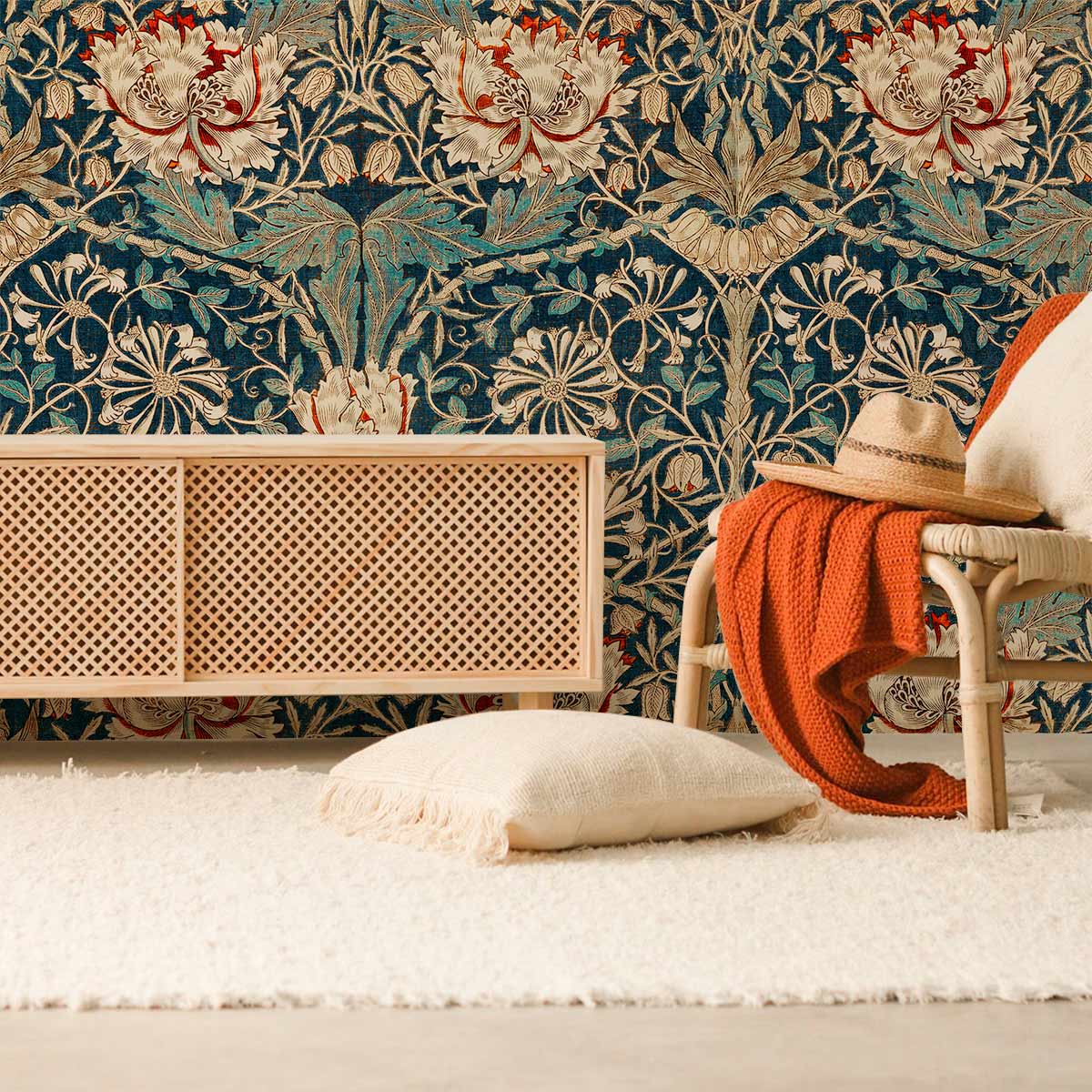 The Honeysuckle Wallpaper Mural captivates with its intricate floral pattern, evoking a sense of luxuriant wilderness. The detailed blossoms and trailing tendrils appear almost hand-painted, creating a sophisticated tapestry of nature. Ideal for spaces needing a touch of classic elegance, this mural pairs beautifully with both contemporary and traditional interiors, offering a timeless appeal.