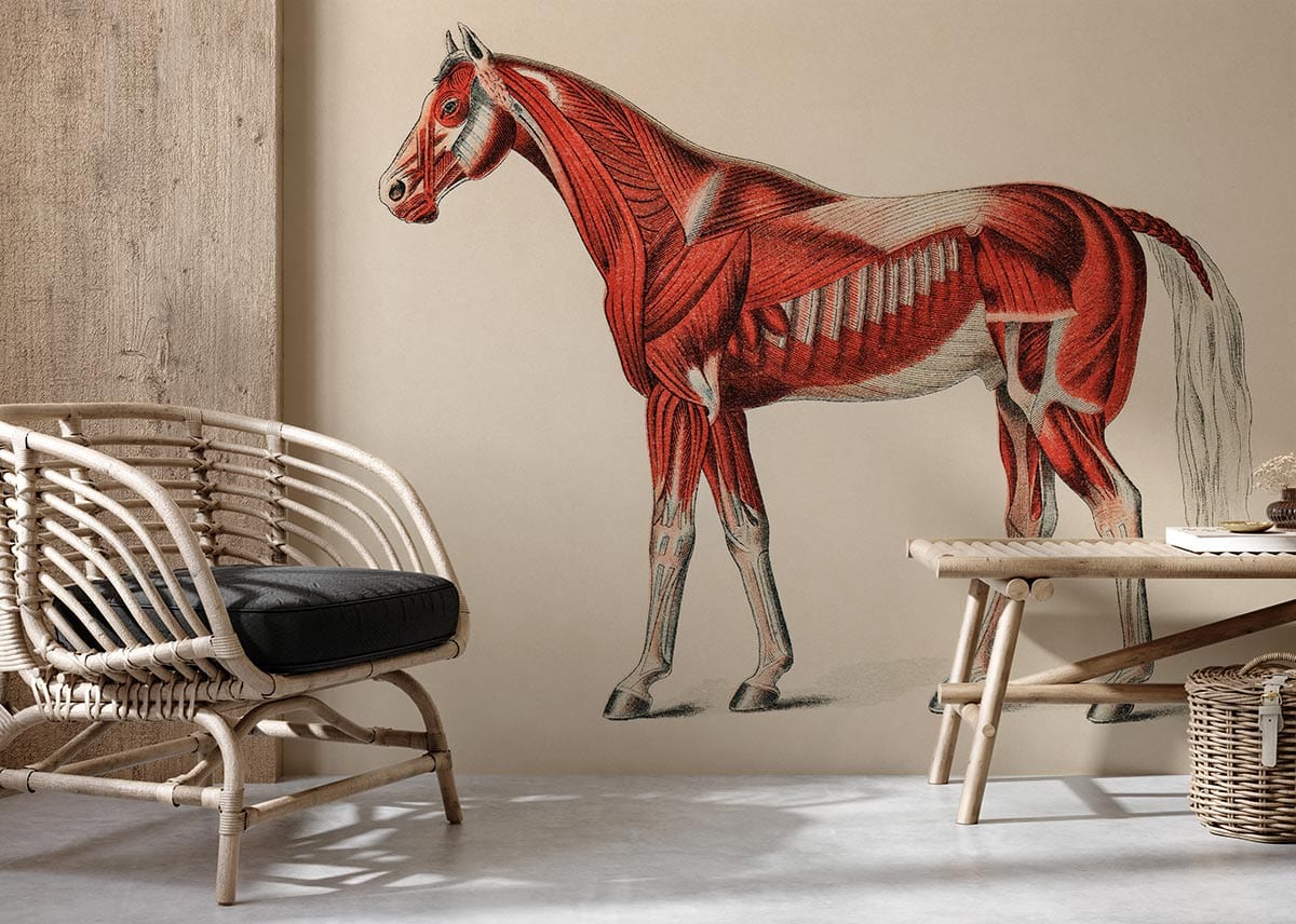 Whether a gorgeous decor or a perfect gift for horse lovers, our Horse Muscle Wallpaper Mural can give you both. The combination of horse muscles, bones, and skeleton will bring charm to your bedroom or living room walls. The red and white colour scheme is a classic blend that contributes to the playfulness and creativity of this mural. This animal-themed wallpaper is the perfect choice for anyone who loves horse and wants to decorate their home with this cool design.
