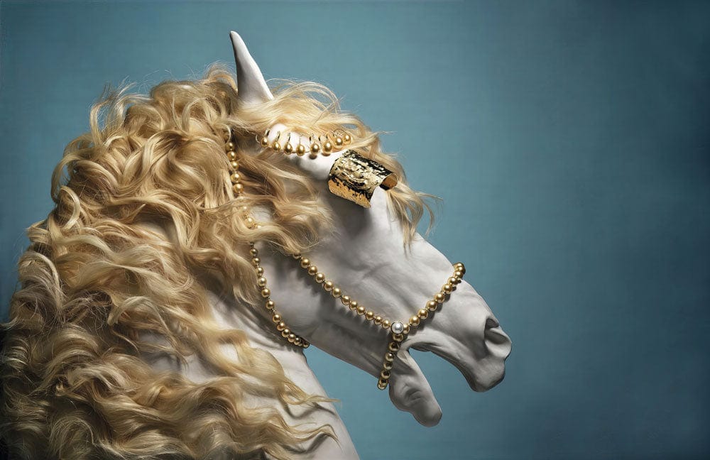 This Horse with Hair Wallpaper Mural presents a stunning portrayal of equine elegance with luxurious golden curls cascading over a serene blue backdrop. The intricate detailing of the horse's ornamental bridle and the textured mane imbue this piece with a sense of artistic finesse and opulence. Its refined design bridges the gap between classic and contemporary décor, making it a captivating focal point in any sophisticated interior.