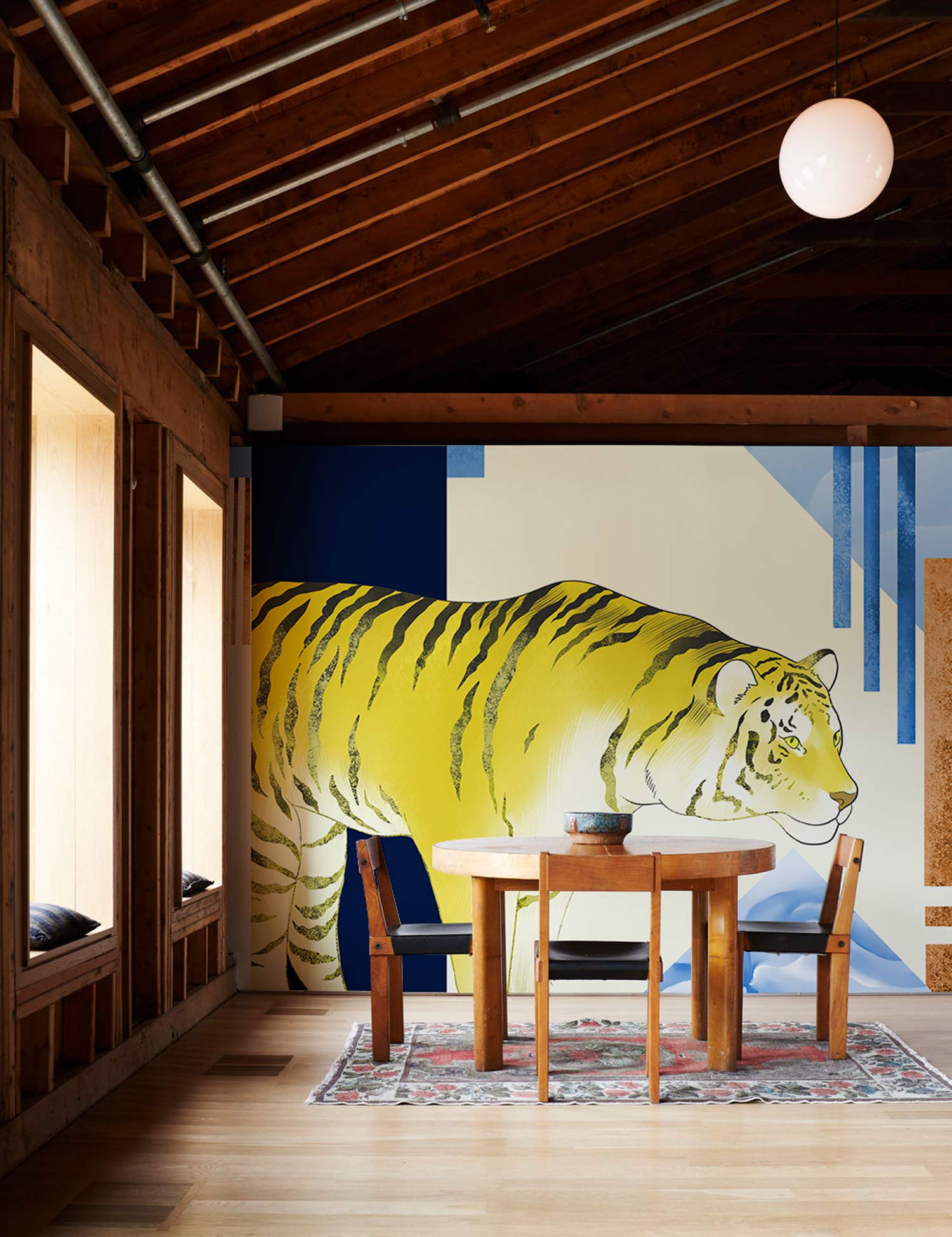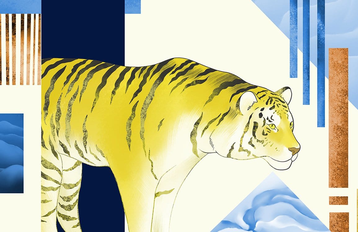 The Tiger II Wallpaper Mural elegantly features a striking depiction of a tiger amidst geometric patterns, juxtaposing nature's wild beauty with artistic architectural elements. Its bold lines and rich textures evoke a sense of refined wilderness, radiating sophistication and timelessness that effortlessly complements both classic and contemporary interiors.