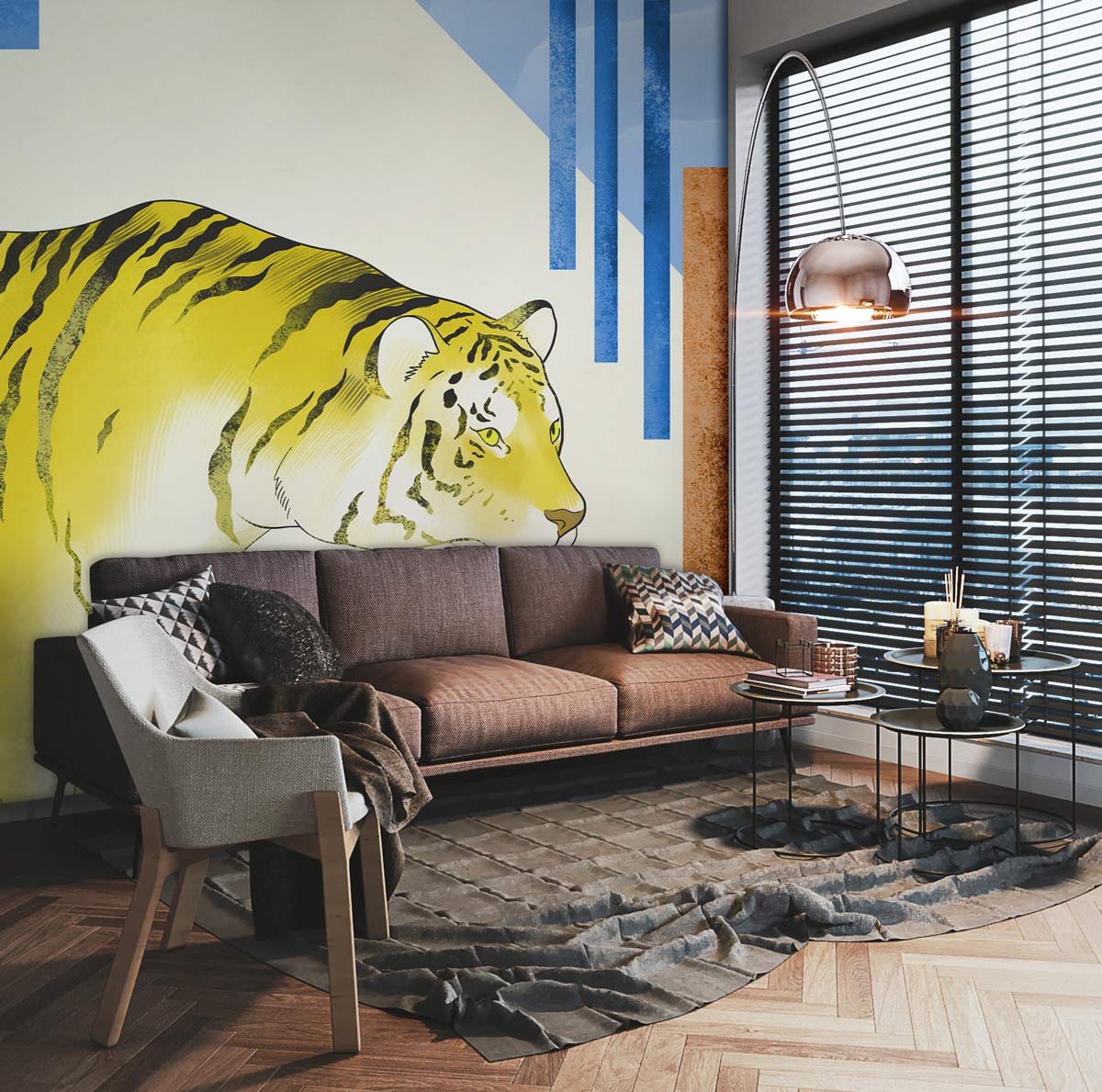 Create an eye-catching interior space with this beautiful tiger wallpaper mural. This huge tiger motif uses vivid hand-painted style design which will surely brings you a strong visual impact. Why not use it in your living room or hallway for a striking effect and impress your guests.