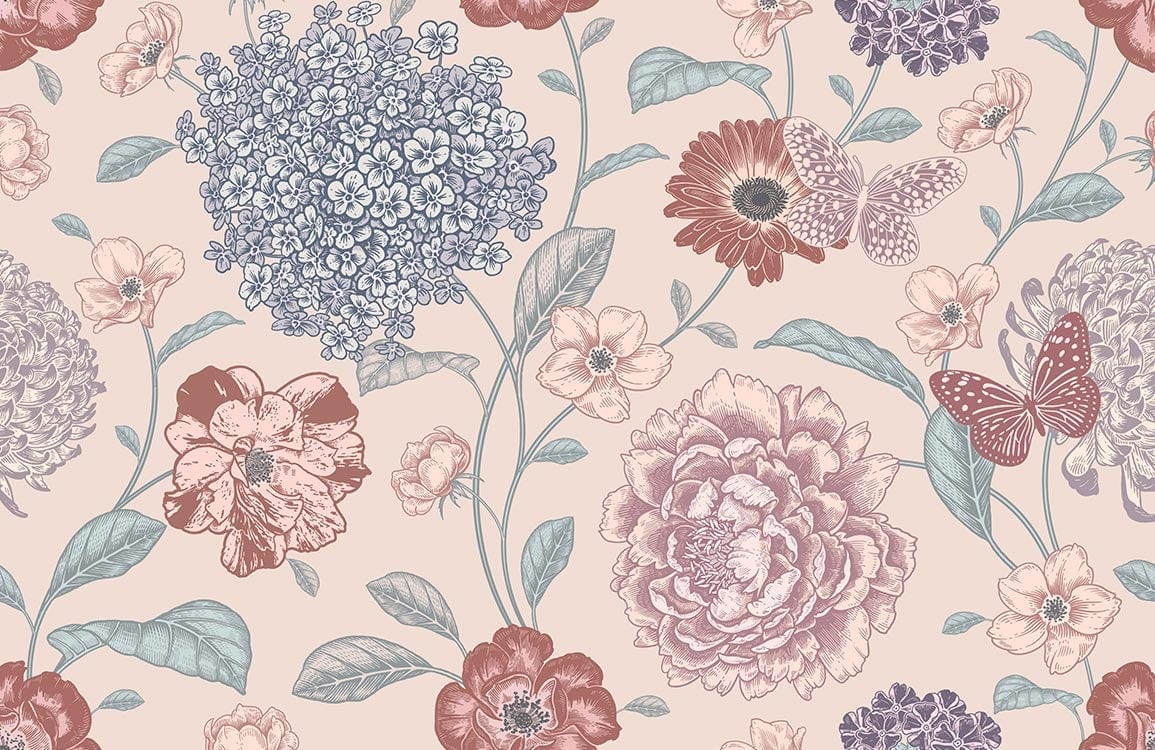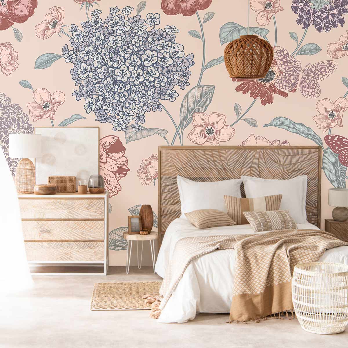 Your walls will bloom with our hydrangea pattern mural wallpaper in pastel hues. Inspired by panels of petals, stems, and blooms, this design will certainly create a vivid backdrop for your space. A beautiful country garden scene made-up of hydrangea blossoms in blush tones will make any room an oasis of serenity and relaxation. But for the best results, pair it with other floral or garden-themed decorations, and you will produce a flawless and cohesive display.