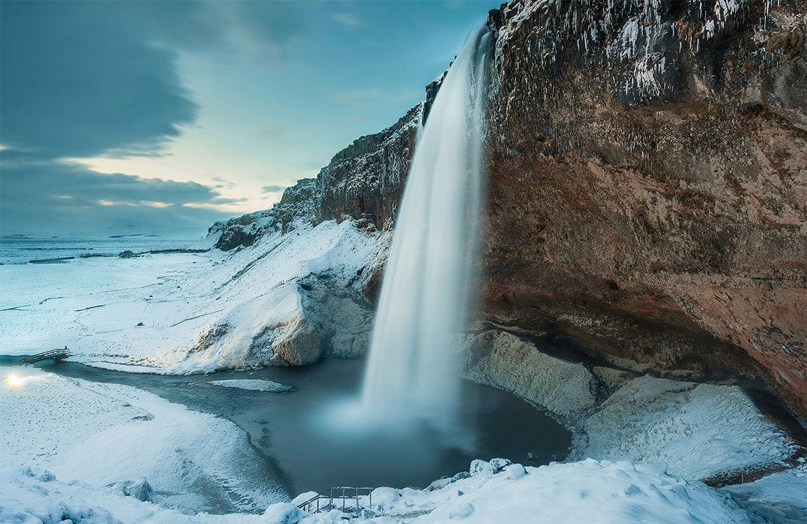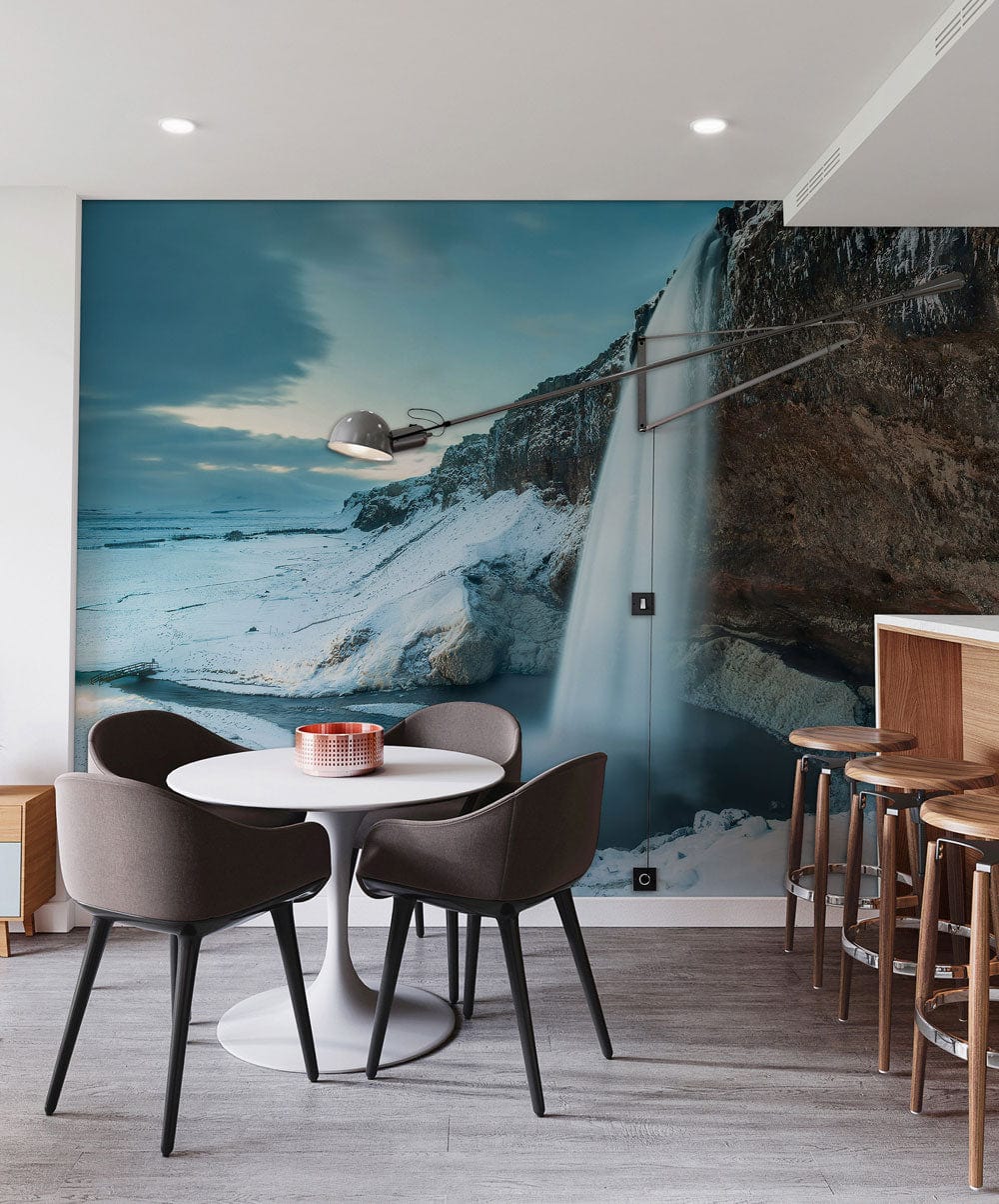 Feel the coolness of the Artic with our Iceberg Waterfall Wallpaper Mural. This wallpaper mural will create a cool and contemporary look in your home. The scenic design shows a stunning waterfall cascading down into an ice-blue lake, where icebergs float peacefully near the shoreline. This mural wallpaper offers a crisp design that brings a refreshing natural feel to any room. Easy-to-apply, can be cut into shapes, and trimmed to fit around any corners or edges, you can also mix-and-match it with other coordinating designs to create your own unique look!