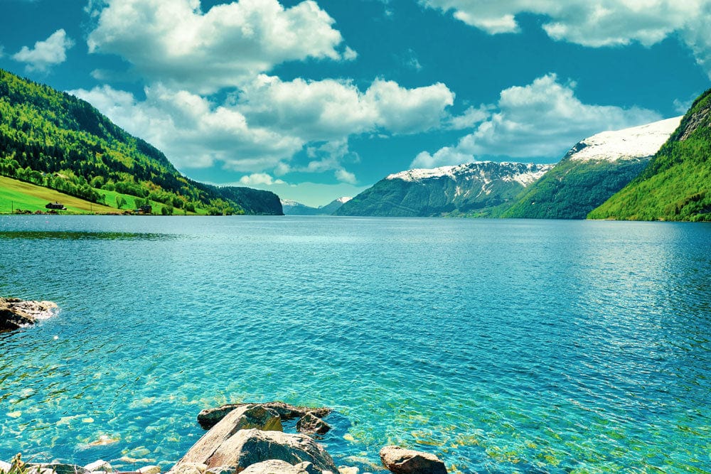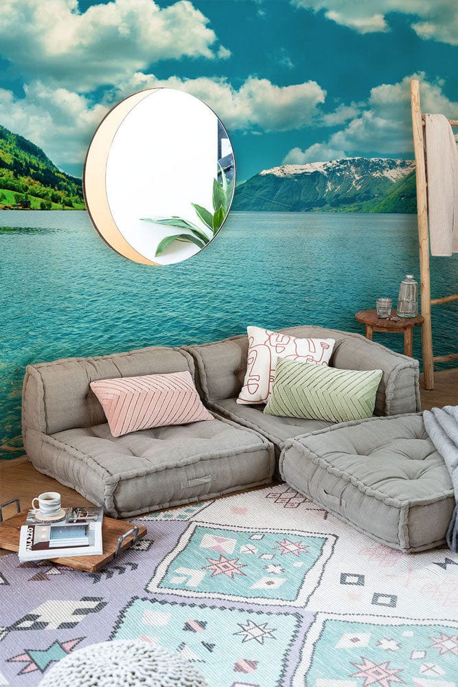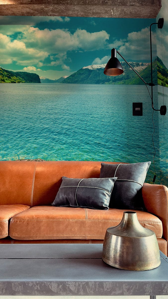 Escape to serene tranquillity with the Immersed with Lake Wallpaper Mural. This exquisite piece showcases a lush lakeside panorama, blending rich blues and vibrant greens with the timeless elegance of snow-capped peaks. Ideal for creating a breathtaking focal point, it brings a sophisticated touch to any interior, seamlessly complementing both traditional and contemporary décor.