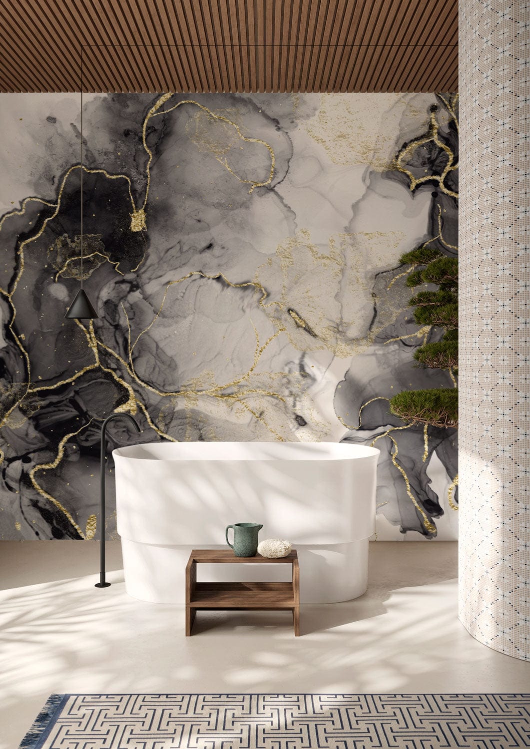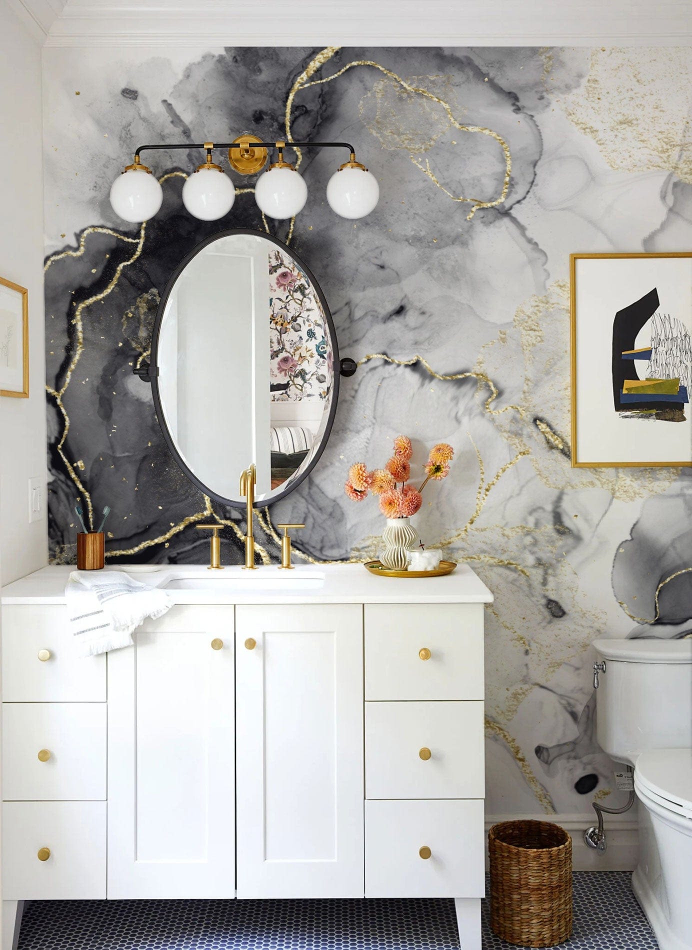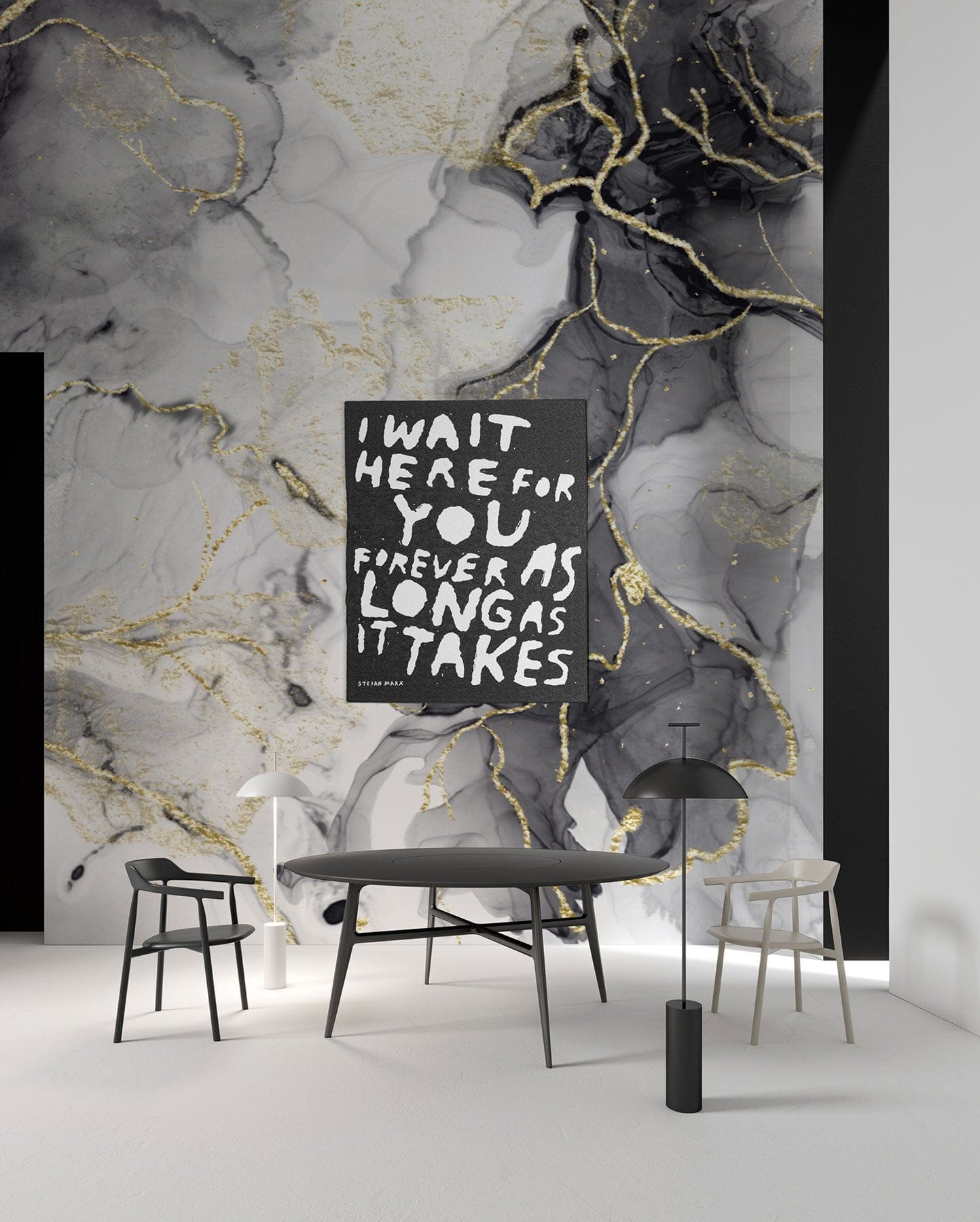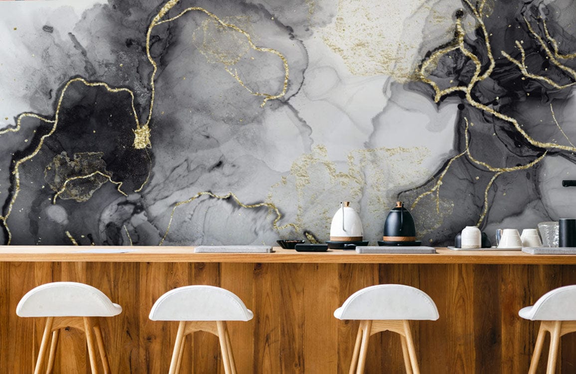 The Ink & Gilding Wallpaper Mural features a stunning fusion of swirling inky textures highlighted with delicate gilded lines. Its rich, swirling patterns create a sense of depth and movement, making it an exquisite focal point in any room. This mural's intricate design captures both opulence and subtlety, perfectly suited for adding a sophisticated touch to contemporary or classic interiors.