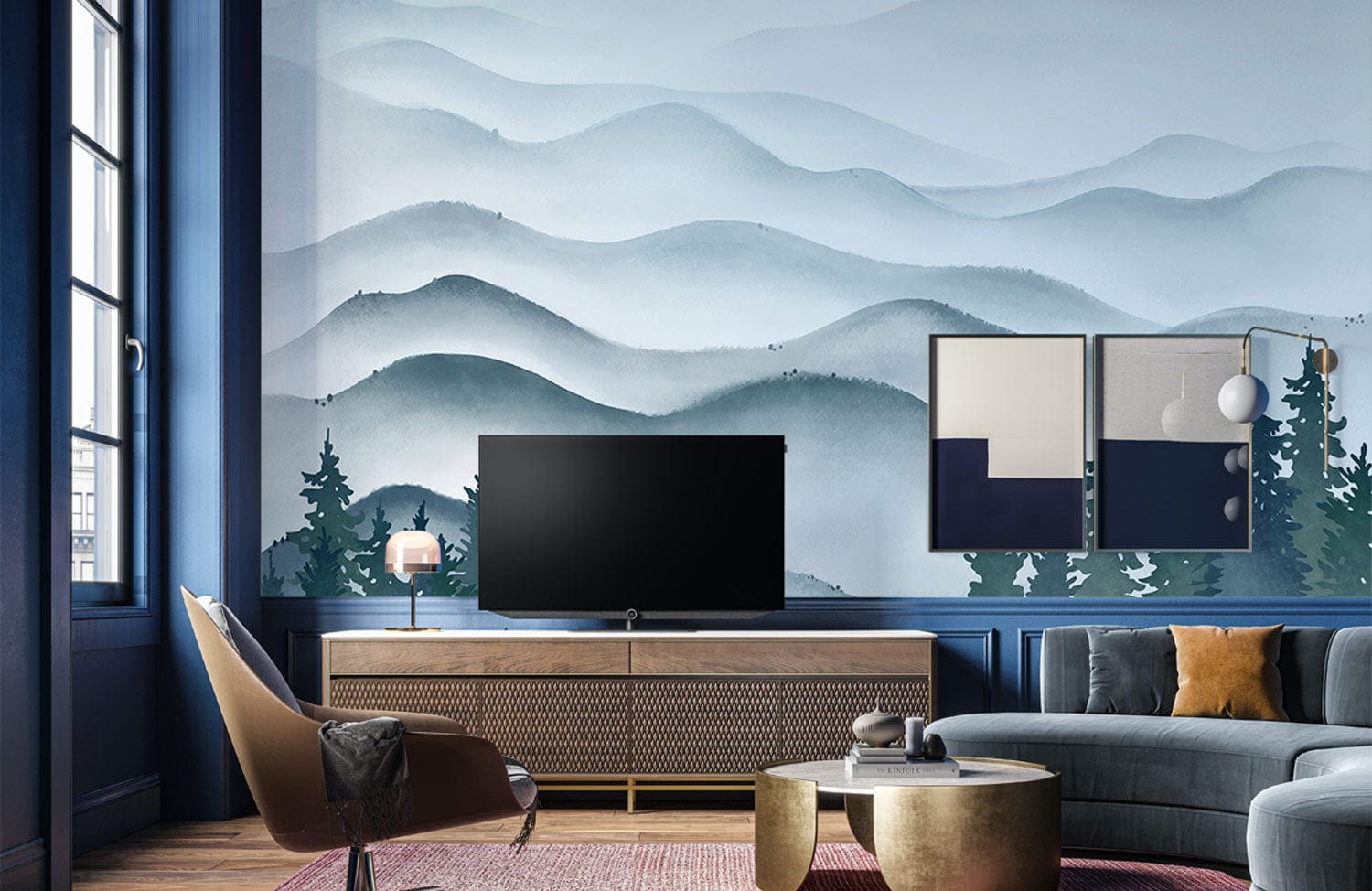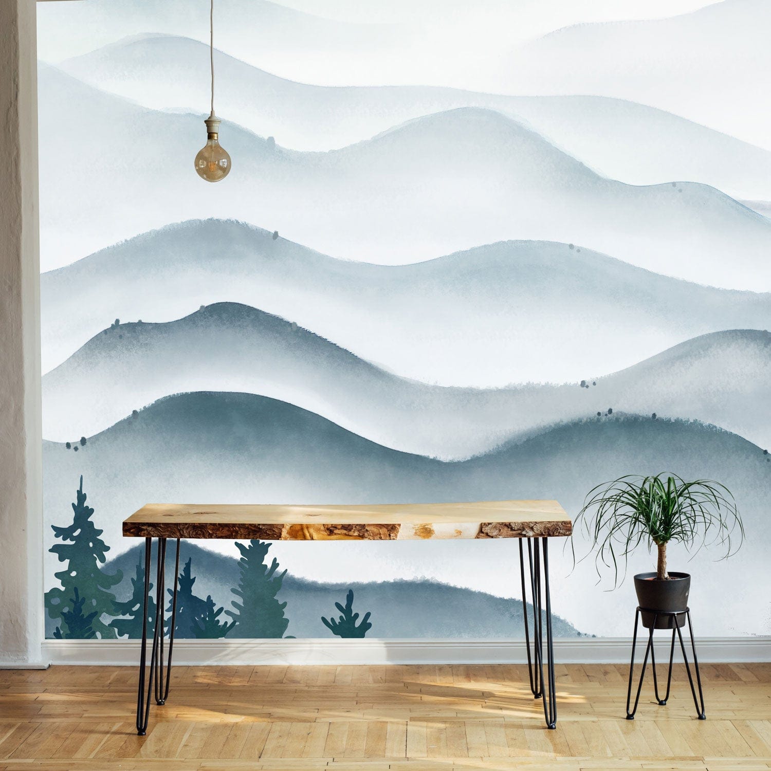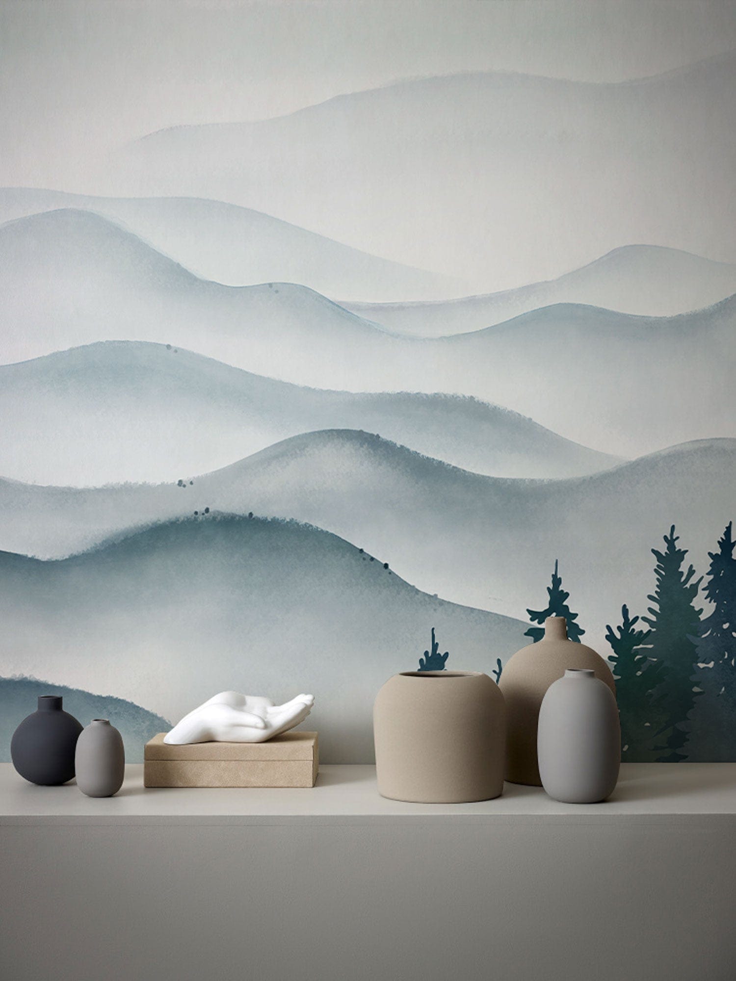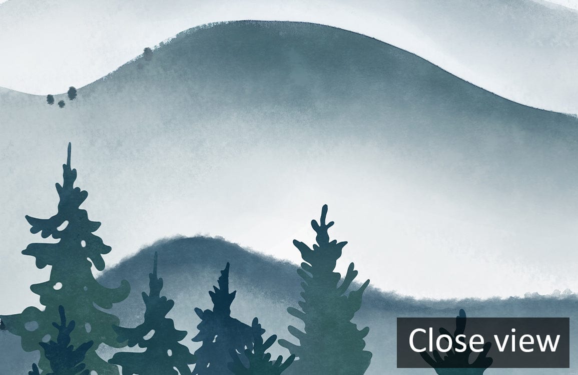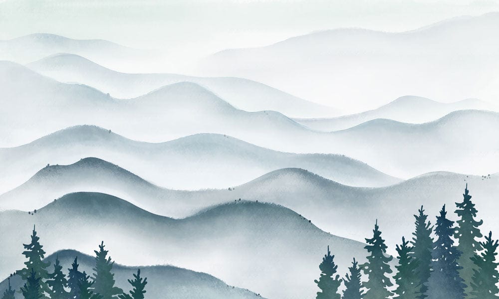 The Ink Mountain Waves Wallpaper Mural beautifully captures the serene elegance of rolling mist-covered hills, blending soft gradients of blue and grey with intricate tree silhouettes. This mural infuses a calm sophistication into any room, making it a perfect backdrop for both contemporary and classic interiors.
