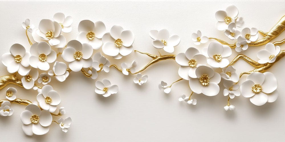 Delicate ivory blossoms unfold along sculpted golden branches, creating a refined balance of softness and luxury. The layered, almost sculptural florals bring a calm yet elegant presence, adding warmth and light to interiors while maintaining a clean, timeless aesthetic that feels both modern and graceful.