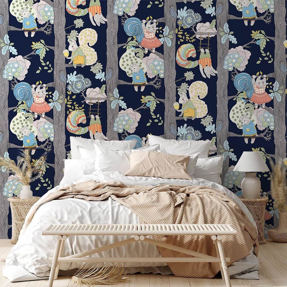 Our Jasper Squirrels Game Wallpaper Mural is a wonderful alternative to your kids' bedroom or playground. As kids love the different pastimes shown here, a bright pattern of jasper squirrels hanging from nearby trees will undoubtedly provide them with infinite entertainment. This animal wallpaper mural is finished in a pale colour scheme to blend nicely with the rest of your child's wall decor. A succession of lovely trees, squirrels, and other activities they play inspired the design.