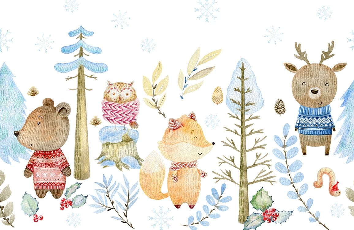 In the winter of forest, joyful animals like bear, deer, owl and squirrel gather together. This adorable wallpaper mural is a perfect decor on your wall. This beautiful, amazing painting of with a White colour background will be perfect for the indoors in your home. Interesting rendering with a natural atmosphere and a refreshing wall decoration. Amazing wall covering for child's room, nursery room and playroom.