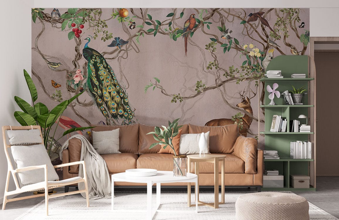 Immerse your space in the enchanting allure of the Jungle Animals Family Wallpaper Mural II. This sophisticated mural features a stunning tableau of forest creatures artfully intertwined with delicate vines, presenting a harmonious blend of flora and fauna. Detailed illustrations of elegant peacocks, charming deer, and vibrant tropical birds bring a touch of exotic beauty. The mural's exquisite depiction evokes a sense of timeless serenity, making it a refined choice for any setting.