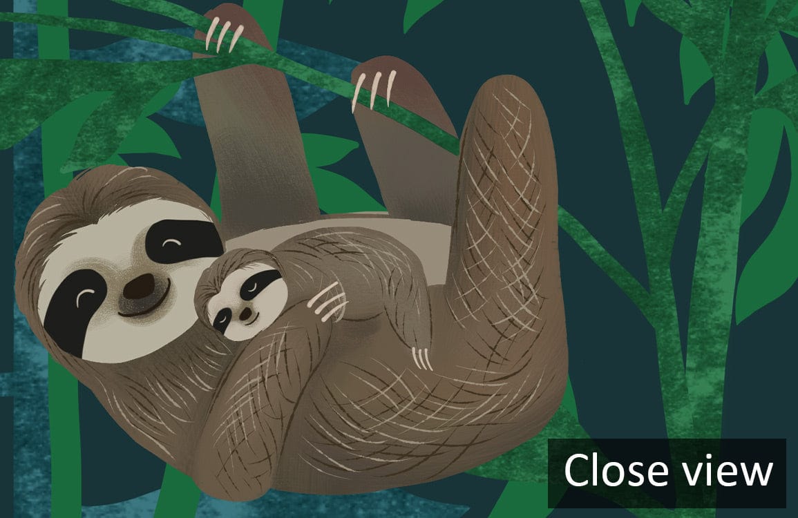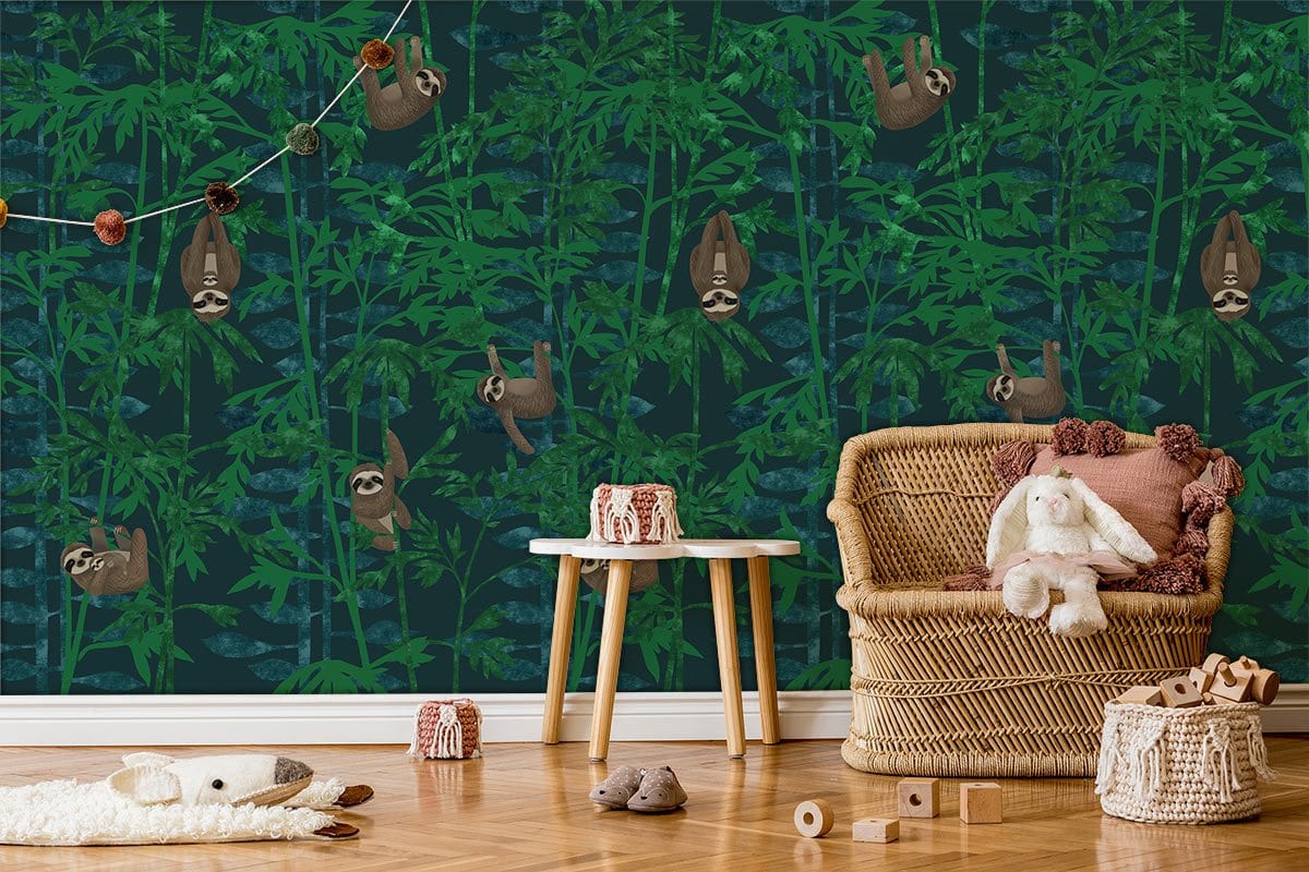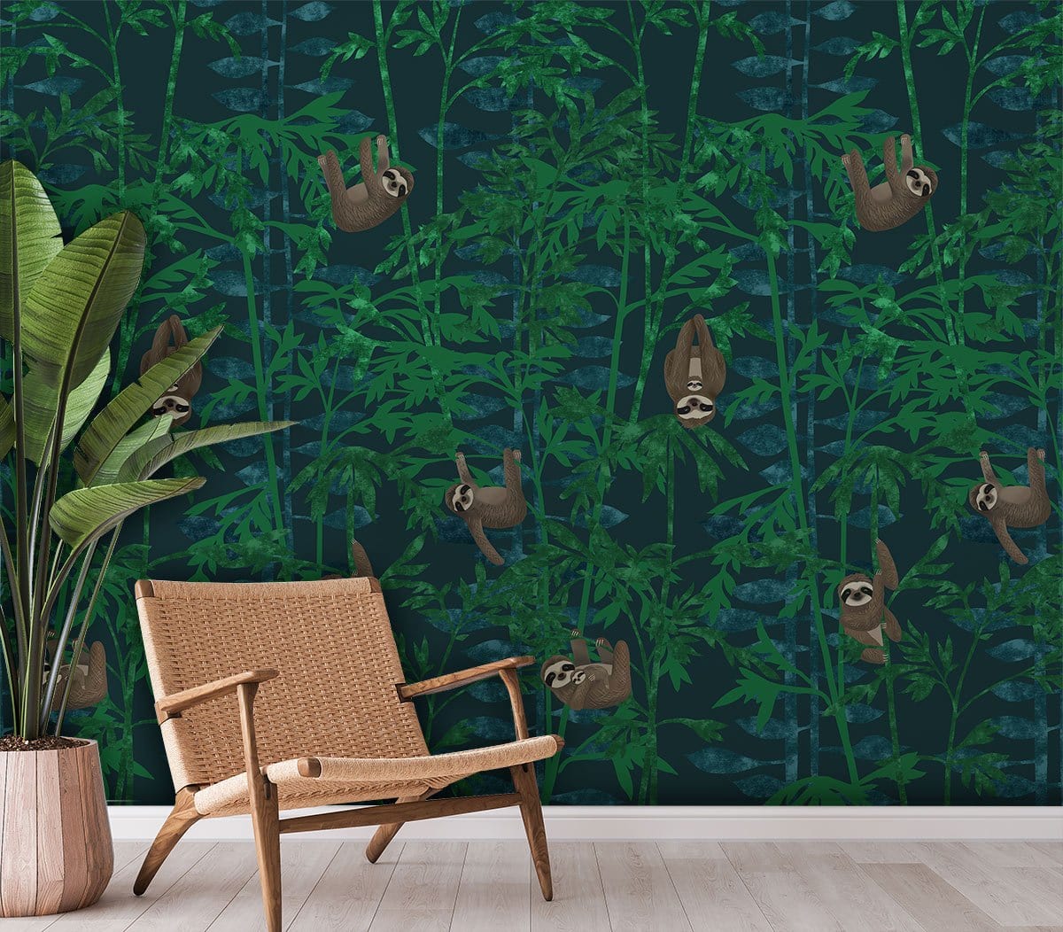 Make your children smile with our beautiful sloth wallpaper mural. This Wallpaper is designed in repeat patterns of cute sloth hanging and swinging on the trees in jungle, which will surely steal your heart. Bring your home some freshness and natural touch with this wall mural. It will look great in your living room, bedroom, kid's room and baby nursery.